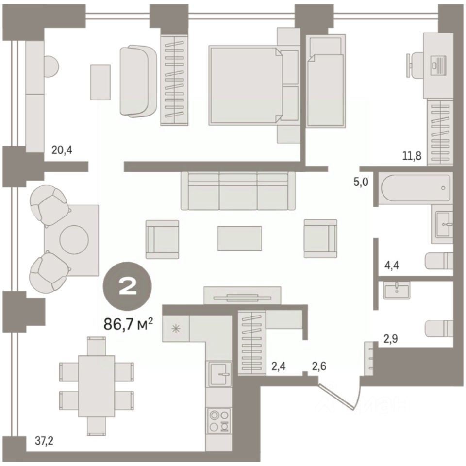 2-комн. квартира с предчистовой отделкой в Квартал Мылзавод на 5 этаже. Общая площадь: 86.67 кв.м., жилая: 32.2 кв.м., площадь просторной кухни-гостиной: 37.2 кв.м. Квартира угловая, очень светлая, естественная вентиляция при открытии окон. В квартире один совмещенный и один раздельный санузел. Высота потолков 2.72 м. Квартира находится в корпусе 9. Дом монолитный, одноподъездный, высотой 30 этажей. На этаже 9 квартир. В подъезде 1 пассажирский и 3 грузовых лифта. Окончание строительства - 1 квартал 2027 года. Оформление сделки по договору долевого участия. Квартира с кухней-гостиной и двумя спальнями в квартале ''Мылзавод''. Особенности планировки: предчистовая отделка. квартиры в нашей базе: МЛ-ГП4.2-9-9.5.6. Квартал ''Мылзавод'' расположен в границах улиц Некрасова, Каменская, Писарева и Семьи Шамшиных. Во времена НЭПа на этом месте появилось промышленное предприятие, выпускавшее более тридцати видов мыла. Его продукция славилась высоким качеством и шла на экспорт. Восемь лет назад городские власти решили перенести все заводы из центральной части Новосибирска и отдали этот участок под жилую застройку. Ревитализация промышленных территорий — обычная для европейских городов практика. Она дает возможность насытить старые, неиспользуемые территории новыми востребованными функциями и таким образом ''вернуть'' городу утраченные пространства. Сегодня вокруг квартала уже сформирована транспортная и социальная инфраструктура. Жители ''Мылзавода'' смогут быстро добраться до главных достопримечательностей города — театра оперы и балета, ''Глобуса'' и краеведческого музея. В шаговой доступности расположены автобусные остановки, две станции метро, четыре школы, а также один из самых больших торговых центров города — ''Галерея''. Квартал состоит из двух 9-этажных урбан-вилл, четырех 17-этажных и трех 30-этажных башен, объединенных стилобатом. В основу концепции ''Мылзавода'', которую Брусника разрабатывала совместно с голландскими и немецкими архитекторами, лег принцип mixed-use . Он предполагает совмещение в пределах одной локации жилого, рабочего, коммерческого и культурно-развлекательного пространств. На первых этажах домов разместятся продуктовые магазины, кафе, офисы, а также частный детский сад на 100 мест. Если Вы - риелтор, пожалуйста, за более подробной информацией обратитесь на горячую линию на нашем официальном сайте. #2ST8F8