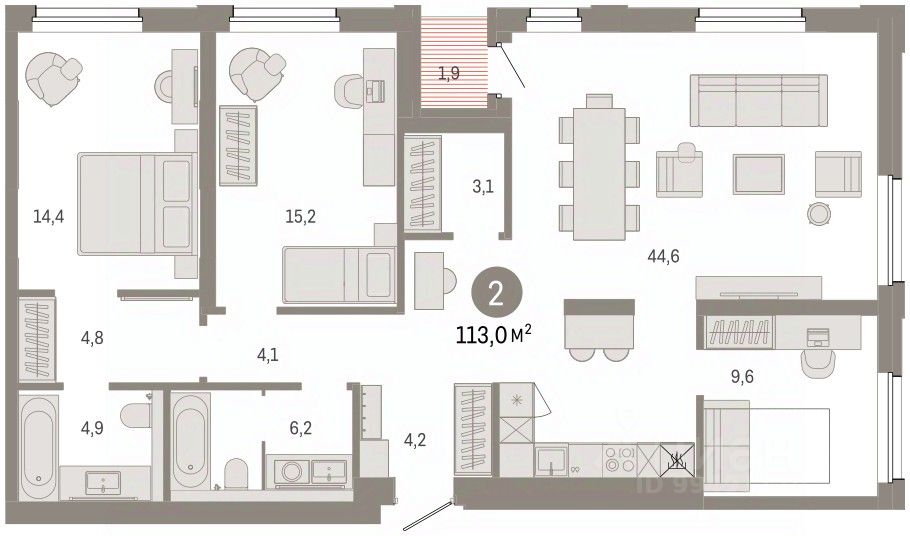 Двухкомнатная квартира от застройщика с предчистовой отделкой в ЖК ''Город-на-озере'' на 8 этаже. Общая площадь: 112.96 кв.м., жилая: 29.6 кв.м., площадь просторной кухни-гостиной: 44.6 кв.м. Угловая квартира, окна oбecпeчивaют paвнoмepнoe ocвeщeниe в тeчeниe дня. В квартире одна лоджия, два совмещенных санузла. Высота потолков 3.0 м. Дом монолитный, многоподъездный, переменной этажности, от 9 до 24 этажей. Квартира находится в 9-й секции высотой 9 этажей в корпусе 1. На этаже 8 квартир. В подъезде 1 пассажирский и 1 грузовой лифт. Окончание строительства - 4 квартал 2028 года. Оформление сделки по договору долевого участия. Квартира с кухней-гостиной и двумя спальнями в проекте Город-на-озере. Особенности планировки: второй санузел, мастер-спальня, предчистовая отделка, рабочий кабинет. квартиры в нашей базе: ГРД01-Ж9.8.1. Город-на-озере находится в Центральном районе Новосибирска, на пересечении Ипподромской магистрали и улицы Фрунзе. По этим крупным транспортным артериям легко добраться в любое место города и на автомобиле, и на общественном транспорте. До ближайших автобусных остановок — 5 минут пешком, а до станции метро ''Березовая Роща'' — 10 минут. В радиусе 1,5 км вокруг квартала уже сформирована необходимая инфраструктура. Здесь есть детские сады, школы, больницы, аптеки, спортивные клубы, торговые центры с супермаркетами, ресторанами и кинотеатрами. Для большего комфорта жителей Город-на-озере обеспечат собственной инфраструктурой. В квартале будет свой торговый центр с магазинами и полезными сервисами. Город взял на себя обязательство создать рядом образовательный кластер — два детских сада и две школы. Особенность квартала — озеро Верховое. Жители района смогут прогуляться по набережной, вокруг водоёма, где будет круговой пешеходный маршрут, с разными зонами отдыха. Кроме того, в пешей доступности от Города-на-озере находятся еще два городских парка: ''Центральный'' и ''Березовая роща''. Город-на-озере — проект комплексного развития территории (КРТ) по принципу многофункциональной застройки, или mixed-use. Это когда на одной территории сочетаются жилая, коммерческая, социальная и рекреационная инфраструктура. К 2032 году здесь появятся разноэтажные жилые дома с приватными дворами, образовательный кластер, деловой центр, торговая улица и общественные пространства, открытые для всех горожан. Люди смогут жить и работать в Городе-на-озере, а в обеденный перерыв совершать променад вокруг озера. Локация квартала уникальна: с одной стороны он соседствует с активным уличным фронтом, а с другой — с тихим и спокойным озером с обильным озеленением. При этом участок неровный, перепад высот достигает 30 метров — это высота восьмиэтажного дома. Для разработки проекта мы пригласили лучшие архитектурные бюро из Китая: AEDAS и Turenscape. AEDAS специализируются на создании качественных общественных пространств, а Turenscape — на работах с экосистемой водных объектов. Архитекторы учли особенности местности и объединили урбанистический и природ