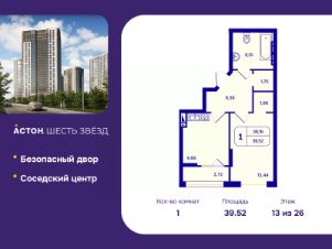 Квартиру можно купить по семейной ипотеке. Информация по телефону, мы вам все подробно расскажем! 1-комн. квартира с предчистовой отделкой в ЖК ''Астон. Шесть Звезд'' на 12 этаже. Общая площадь: 39.52 кв.м., жилая: 12.44 кв.м., площадь просторной кухни-столовой: 9.88 кв.м. Все окна выходят на одну сторону. В квартире одна лоджия, один совмещенный санузел. Высота потолков 2.65 м. Квартира находится в корпусе 2А. Дом монолитный, одноподъездный, высотой 26 этажей. На этаже 16 квартир. В подъезде 5 грузовых лифтов. Окончание строительства - 4 квартал 2026 года. Оформление сделки по договору долевого участия. ''Астон.Шесть звезд'' - современный комплекс из 26-этажных домов класса ''комфорт плюс'' с уютными квартирами, вдохновляющими видами на левобережье, продуманной организацией жилого пространства, стильным дизайном общественных интерьеров и авторским благоустройством. Природа рядом, для этого ненужно ехать далеко загород. В районе жилого комплекса расположен парк Бугринская роща, в котором есть масса развлечений для вас и вашей семьи:- парк аттракционов- кемпинг ''Бугринская гавань'' с зонами барбекю- зимний каток и зона для катания на снегоходах- лыжная база ''Сибирь''- летом благоустроенный пляж В 10 минутах ходьбы находится большой футбольный стадион, также поблизости есть конный клуб ''Мустанг''. В пределах 15 минут езды на общественном транспорте расположены учебные заведения - Новосибирский Государственный Технический Университет, Сибирский университет потребительской кооперации и колледжи. Фасады жилого комплекса - воплощение современного стиля. Такой эффект дает сочетание строгих линий, благородных оттенков натуральных материалов и блеска вертикального витражного остекления. Авторский дизайн холлов сочетает натуральные оттенки и фактуры дерева, керамогранита, декоративной штукатурки. Обилие света и воздуха создает сочетание стеклянных и зеркальных элементов со стильной трековой подсветкой, дополненной акцентнвми бра. Мягкие зоны в таком антураже особенно уютны и удобны для коротких встреч или ожидания курьера. Квартира будет просторнее, если оставить коляску, велосипед или игровой инвентарь в колясочной с удобными полками. Хранить не сезонные вещи можно в личной кладовой. Благоустроенный закрытый двор спроектирован с учетом безопасности и многофункциональности пространства - здесь можно поиграть с детьми, заняться спортом или просто отдохнуть в парковой зоне. Центром притяжения в ''Астон.Шесть звезд'' станет современный и функциональный комьюнити-центр. Это не просто модное слово, а забота о комфорте и хорошем настроении жителей комплекса. Здесь можно спокойно поработать утро, встретиться с соседями за чашкой чая или провести небольшое мероприятие. #zMUzWD