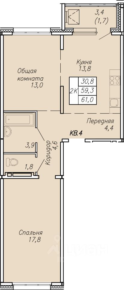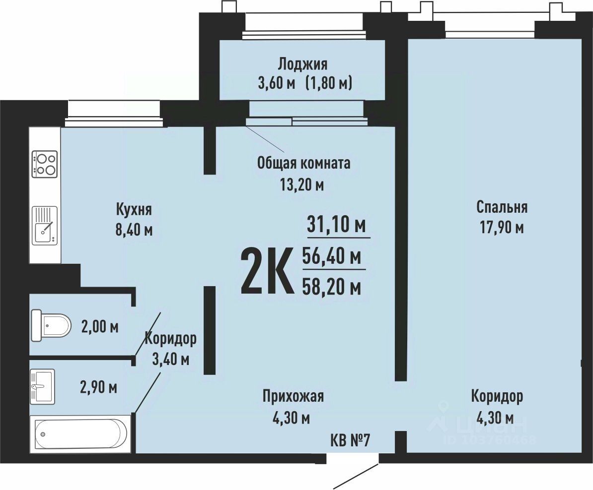 58 м² · Этаж 7 из 17