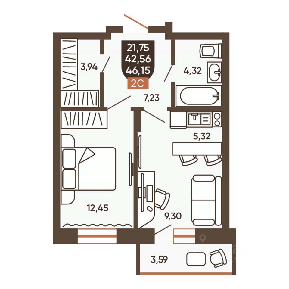 42 м² · Этаж 9 из 19