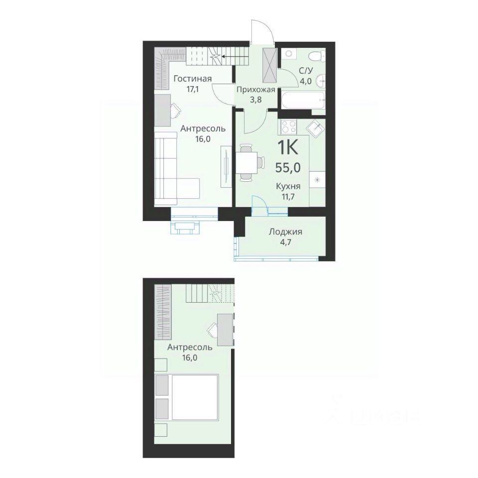 55 м² · Этаж 15 из 15