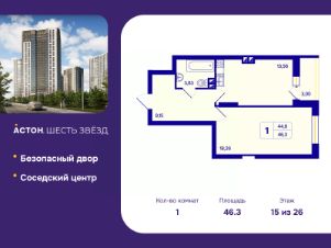 1-комн. квартира с предчистовой отделкой в ЖК ''Астон. Шесть Звезд'' на 15 этаже. Общая площадь: 46.3 кв.м., жилая: 18.26 кв.м., площадь просторной кухни-столовой: 13.56 кв.м. Все окна выходят на одну сторону. В квартире одна лоджия, один совмещенный санузел. Высота потолков 2.65 м. Квартира находится в корпусе 2А. Дом монолитный, одноподъездный, высотой 26 этажей. На этаже 16 квартир. В подъезде 5 грузовых лифтов. Окончание строительства - 4 квартал 2026 года. Оформление сделки по договору долевого участия. ''Астон.Шесть звезд'' - современный комплекс из 26-этажных домов класса ''комфорт плюс'' с уютными квартирами, вдохновляющими видами на левобережье, продуманной организацией жилого пространства, стильным дизайном общественных интерьеров и авторским благоустройством. Природа рядом, для этого ненужно ехать далеко загород. В районе жилого комплекса расположен парк Бугринская роща, в котором есть масса развлечений для вас и вашей семьи:- парк аттракционов- кемпинг ''Бугринская гавань'' с зонами барбекю- зимний каток и зона для катания на снегоходах- лыжная база ''Сибирь''- летом благоустроенный пляж В 10 минутах ходьбы находится большой футбольный стадион, также поблизости есть конный клуб ''Мустанг''. В пределах 15 минут езды на общественном транспорте расположены учебные заведения - Новосибирский Государственный Технический Университет, Сибирский университет потребительской кооперации и колледжи. Фасады жилого комплекса - воплощение современного стиля. Такой эффект дает сочетание строгих линий, благородных оттенков натуральных материалов и блеска вертикального витражного остекления. Авторский дизайн холлов сочетает натуральные оттенки и фактуры дерева, керамогранита, декоративной штукатурки. Обилие света и воздуха создает сочетание стеклянных и зеркальных элементов со стильной трековой подсветкой, дополненной акцентнвми бра. Мягкие зоны в таком антураже особенно уютны и удобны для коротких встреч или ожидания курьера. Квартира будет просторнее, если оставить коляску, велосипед или игровой инвентарь в колясочной с удобными полками. Хранить не сезонные вещи можно в личной кладовой. Благоустроенный закрытый двор спроектирован с учетом безопасности и многофункциональности пространства - здесь можно поиграть с детьми, заняться спортом или просто отдохнуть в парковой зоне. Центром притяжения в ''Астон.Шесть звезд'' станет современный и функциональный комьюнити-центр. Это не просто модное слово, а забота о комфорте и хорошем настроении жителей комплекса. Здесь можно спокойно поработать утро, встретиться с соседями за чашкой чая или провести небольшое мероприятие. #2mVclB