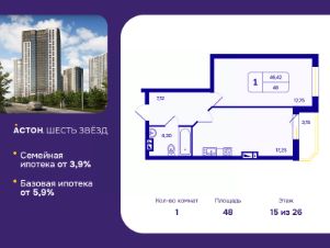 Просторная однокомнатная квартира с предчистовой отделкой в ЖК ''Астон. Шесть Звезд'' на 15 этаже. Общая площадь: 48 кв.м., жилая: 17.75 кв.м., площадь просторной кухни-столовой: 17.25 кв.м. Все окна выходят на одну сторону. В квартире одна лоджия, один совмещенный санузел. Высота потолков 2.65 м. Квартира находится в корпусе 2Б. Дом монолитный, одноподъездный, высотой 26 этажей. На этаже 7 квартир. В подъезде 5 грузовых лифтов. Окончание строительства - 4 квартал 2026 года. Оформление сделки по договору долевого участия. ''Астон.Шесть звезд'' - современный комплекс из 26-этажных домов класса ''комфорт плюс'' с уютными квартирами, вдохновляющими видами на левобережье, продуманной организацией жилого пространства, стильным дизайном общественных интерьеров и авторским благоустройством. Природа рядом, для этого ненужно ехать далеко загород. В районе жилого комплекса расположен парк Бугринская роща, в котором есть масса развлечений для вас и вашей семьи:- парк аттракционов- кемпинг ''Бугринская гавань'' с зонами барбекю- зимний каток и зона для катания на снегоходах- лыжная база ''Сибирь''- летом благоустроенный пляж В 10 минутах ходьбы находится большой футбольный стадион, также поблизости есть конный клуб ''Мустанг''. В пределах 15 минут езды на общественном транспорте расположены учебные заведения - Новосибирский Государственный Технический Университет, Сибирский университет потребительской кооперации и колледжи. Фасады жилого комплекса - воплощение современного стиля. Такой эффект дает сочетание строгих линий, благородных оттенков натуральных материалов и блеска вертикального витражного остекления. Авторский дизайн холлов сочетает натуральные оттенки и фактуры дерева, керамогранита, декоративной штукатурки. Обилие света и воздуха создает сочетание стеклянных и зеркальных элементов со стильной трековой подсветкой, дополненной акцентнвми бра. Мягкие зоны в таком антураже особенно уютны и удобны для коротких встреч или ожидания курьера. Квартира будет просторнее, если оставить коляску, велосипед или игровой инвентарь в колясочной с удобными полками. Хранить не сезонные вещи можно в личной кладовой. Благоустроенный закрытый двор спроектирован с учетом безопасности и многофункциональности пространства - здесь можно поиграть с детьми, заняться спортом или просто отдохнуть в парковой зоне. Центром притяжения в ''Астон.Шесть звезд'' станет современный и функциональный комьюнити-центр. Это не просто модное слово, а забота о комфорте и хорошем настроении жителей комплекса. Здесь можно спокойно поработать утро, встретиться с соседями за чашкой чая или провести небольшое мероприятие. #zMuzg9