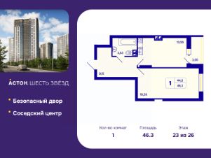Продается однокомнатная квартира от застройщика с предчистовой отделкой в ЖК ''Астон. Шесть Звезд'' на 23 этаже. Общая площадь: 46.3 кв.м., жилая: 18.26 кв.м., площадь просторной кухни-столовой: 13.56 кв.м. Все окна выходят на одну сторону. В квартире одна лоджия, один совмещенный санузел. Высота потолков 2.65 м. Квартира находится в корпусе 2А. Дом монолитный, одноподъездный, высотой 26 этажей. На этаже 16 квартир. В подъезде 5 грузовых лифтов. Окончание строительства - 4 квартал 2026 года. Оформление сделки по договору долевого участия. ''Астон.Шесть звезд'' - современный комплекс из 26-этажных домов класса ''комфорт плюс'' с уютными квартирами, вдохновляющими видами на левобережье, продуманной организацией жилого пространства, стильным дизайном общественных интерьеров и авторским благоустройством. Природа рядом, для этого ненужно ехать далеко загород. В районе жилого комплекса расположен парк Бугринская роща, в котором есть масса развлечений для вас и вашей семьи:- парк аттракционов- кемпинг ''Бугринская гавань'' с зонами барбекю- зимний каток и зона для катания на снегоходах- лыжная база ''Сибирь''- летом благоустроенный пляж В 10 минутах ходьбы находится большой футбольный стадион, также поблизости есть конный клуб ''Мустанг''. В пределах 15 минут езды на общественном транспорте расположены учебные заведения - Новосибирский Государственный Технический Университет, Сибирский университет потребительской кооперации и колледжи. Фасады жилого комплекса - воплощение современного стиля. Такой эффект дает сочетание строгих линий, благородных оттенков натуральных материалов и блеска вертикального витражного остекления. Авторский дизайн холлов сочетает натуральные оттенки и фактуры дерева, керамогранита, декоративной штукатурки. Обилие света и воздуха создает сочетание стеклянных и зеркальных элементов со стильной трековой подсветкой, дополненной акцентнвми бра. Мягкие зоны в таком антураже особенно уютны и удобны для коротких встреч или ожидания курьера. Квартира будет просторнее, если оставить коляску, велосипед или игровой инвентарь в колясочной с удобными полками. Хранить не сезонные вещи можно в личной кладовой. Благоустроенный закрытый двор спроектирован с учетом безопасности и многофункциональности пространства - здесь можно поиграть с детьми, заняться спортом или просто отдохнуть в парковой зоне. Центром притяжения в ''Астон.Шесть звезд'' станет современный и функциональный комьюнити-центр. Это не просто модное слово, а забота о комфорте и хорошем настроении жителей комплекса. Здесь можно спокойно поработать утро, встретиться с соседями за чашкой чая или провести небольшое мероприятие. #ZMgzf4
