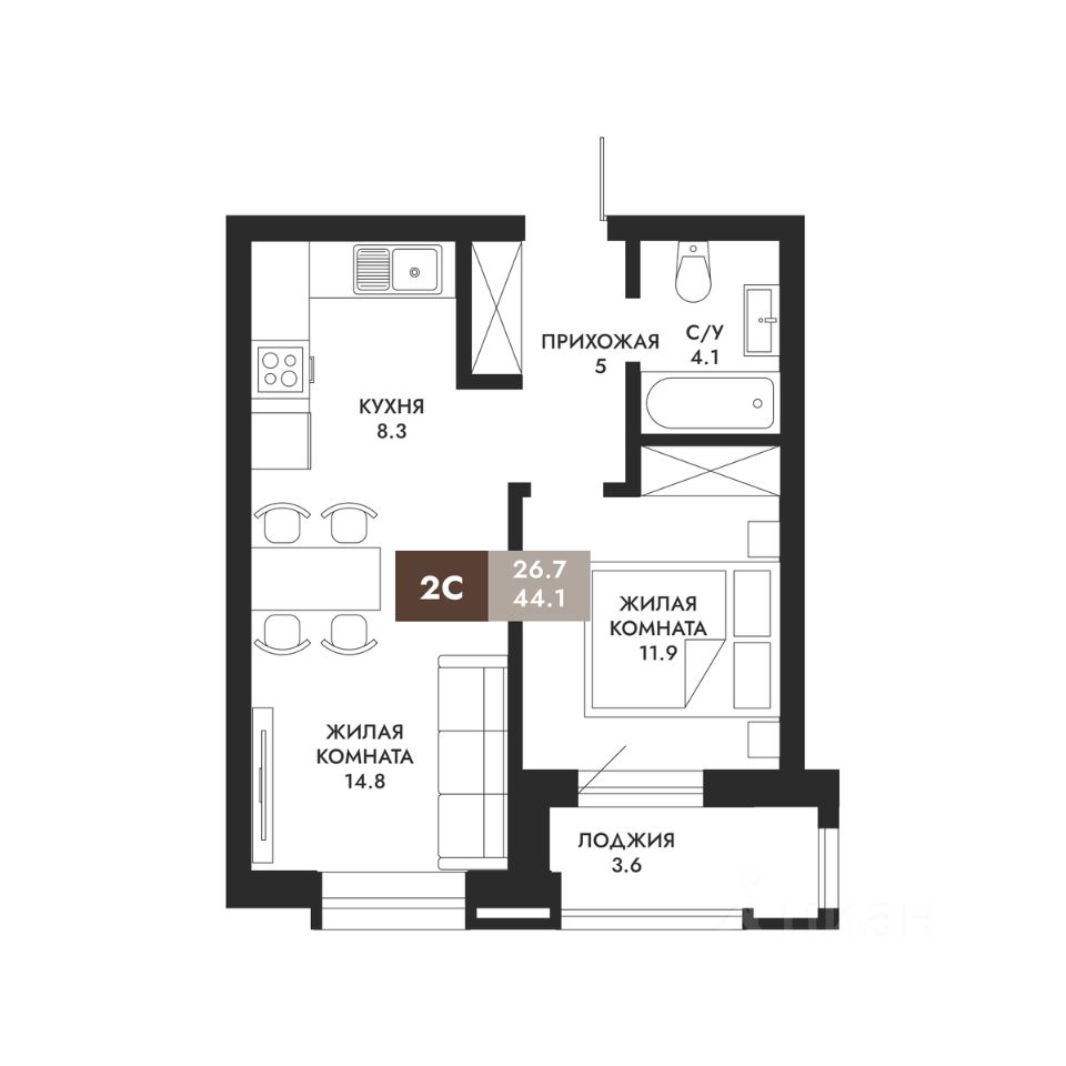 44 м² · Этаж 2 из 23