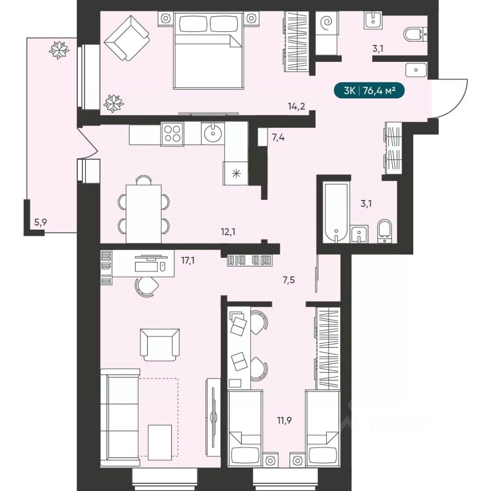 76 м² · Этаж 23 из 25