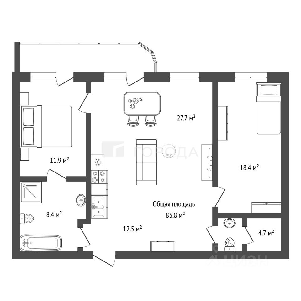 85 м² · Этаж 21 из 26