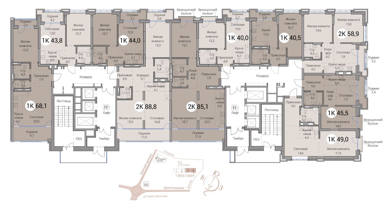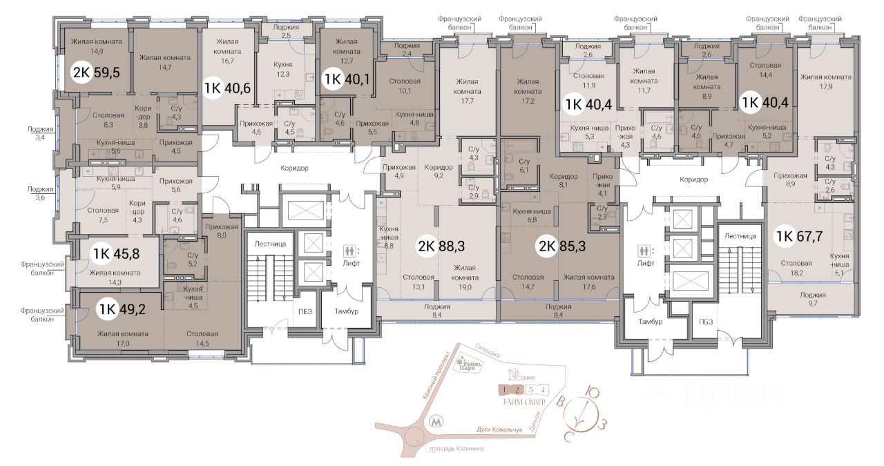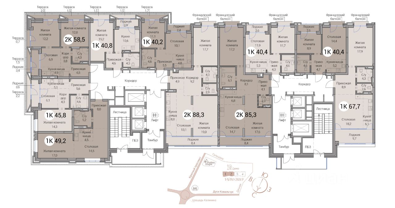 ''Тайм Сквер'' это 25-этажный жилой комплекс, расположенный в спокойном квартале рядом со станциями метро Заельцовская и Гагаринская, сразу за ТРК ''Ройял Парк''. Непосредственно рядом с жилым комплексом раскинется новый сквер площадью около двух гектаров. • Дизайнерские вестибюли с высотой потолков 7 метров • Бесшумные скоростные лифты от квартиры до парковки • Лаунж-зона с WiFi • Закрытая благоустроенная территория • Двухуровневый подземный паркинг • Келлеры-кладовые для хранения. • Умная система доступа • Круглосуточная охрана и видеонаблюдение • Консьерж-сервис • Качественная предфинишная отделка квартир ЖК ''Тайм Сквер'' отличается многообразием планировочных решений: здесь можно выбрать резиденции площадью от 40 до 157 кв.м, в том числе резиденции с террасами, видовые резиденции и двухуровневые хайфлэты с высотой потолков 6 м. Инфраструктура Удобная локация в прямом доступе к центральной части города предоставляет жителям ''Тайм Сквер'' множество возможностей для комфортной жизни. Рядом находятся лучшие образовательные, культурные, медицинские и деловые заведения города, парки, множество детских спортивных и развивающих центров. В пешей доступности: • 5 минут до станций метро Заельцовская, Гагаринская • 5-7 минут до гимназии 9, частной школы ''Аврора'', школы 120, школы ''Журавушка'' • 2-5 минут до государственных и частных детских садов • 1 минута до ТРЦ Ройял Парк • 3 минуты до супермаркета ''Бахетле'' • 15 минут до зоопарка и дендропарка На автомобиле: • 6 минут до гипермаркета METRO • 10 минут до НОВАТа • 10 минут до Заельцовского парка • 15 минут до аквапарка ''Аквамир'' ЖК ''Тайм Сквер'' - проект бренда ''Сибирь Девелопмент''.