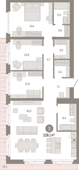 Продаётся 3-комнатная квартира в строящемся доме (Дом 1), срок сдачи: IV-кв. 2028, общей площадью 129.1 кв.м., на 2 этаже. Новый жилой комплекс ''Город-на-озере'' от застройщика ''Брусника'' расположен в Дзержинском районе Новосибирска в границах ул. Ипподромской, ул. Фрунзе, Журинского спуска.