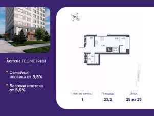 Спешите забронировать по акционной цене! Срок акции ограничен! Стоимость квартиры указана со скидкой, ваша экономия составит 230,000 RUB. Квартиру можно купить по семейной ипотеке со ставкой от 3,5%. Звоните, мы вам все подробно расскажем! 1-комн. квартира-студия от застройщика с предчистовой отделкой в ЖК ''Астон.Геометрия'' на 25 этаже. Общая площадь: 32.41 кв.м., площадь гостиной 21.29 кв.м., из которых 3.81 кв.м. выделено под кухонную зону. Все окна выходят на одну сторону. В квартире одна лоджия, один совмещенный санузел. Высота потолков 2.7 м. Квартира находится в корпусе 4. Дом монолитный, одноподъездный, высотой 25 этажей. На этаже 12 квартир. В подъезде 1 пассажирский и 2 грузовых лифта. Окончание строительства - 2 квартал 2026 года. Оформление сделки по договору долевого участия. Концепция ЖК ''Астон. Геометрия'' объединяет в себе важные составляющие современного жилого комплекса комфорт-класса: качество, комфорт, доступность. Это проект для тех, кто рационально распоряжается финансами и не снижает планку качества. ''Астон. Геометрия'' - уникальное пространство для жизни, расположенное на улице Выборная в уютном, развивающемся районе. Удобная локация позволяет добраться за 15 минут до станции метро. В пешей доступности находится остановка общественного транспорта, где проходит 9 маршрутов, направляющихся в разные части города. Все необходимое для комфортной жизни рядом, в пешей доступности: детские сады и школы, торговые центры, аптеки, магазины, кафе, тренажерные залы, поликлиника. Современный фасад с выразительными цветовыми акцентами органично вписывается в городское пространство. Яркие детали подчеркивают уникальный стиль жилого комплекса. Дизайн холлов является продолжением домашнего уюта. Все двери холла прозрачные, поэтому видно что происходит как внутри, так и снаружи. Вход в подъезд разделен на 2 контура, и только перед вторым контуром установлен домофон, это позволяет чуствовать себя в безопасности и комфорте. В холле предусмотрена мягкая зона, теперь ожидание такси или отдых во время прогулки станет еще комфортнее. Вход в дом - на уровне земли, без порогов и лестниц. Такое решение облегчает доступ для велосипедистов и мам с колясками. Также на первом этаже расположено отдельное помещение для безопасного хранения колясок, самокатов, велосипедов. Соседский центр позволит расширить границы квартир и принимать активное участие в общественной жизни и укреплять отношения между соседями. В центре будет возможно, как и поработать, так и совместно провести время с друзьями или детьми. Здесь можно организовать мероприятие или мастер класс, провести литературный вечер. #zmU2C7