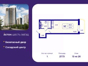 Просторная однокомнатная квартира-студия с предчистовой отделкой в ЖК ''Астон. Шесть Звезд'' на 13 этаже. Общая площадь: 27.73 кв.м., площадь гостиной 17.94 кв.м., из которых 3.38 кв.м. выделено под кухонную зону. Все окна выходят на одну сторону. В квартире один балкон, один совмещенный санузел. Высота потолков 2.65 м. Квартира находится в корпусе 2Б. Дом монолитный, одноподъездный, высотой 26 этажей. На этаже 7 квартир. В подъезде 5 грузовых лифтов. Окончание строительства - 4 квартал 2026 года. Оформление сделки по договору долевого участия. ''Астон.Шесть звезд'' - современный комплекс из 26-этажных домов класса ''комфорт плюс'' с уютными квартирами, вдохновляющими видами на левобережье, продуманной организацией жилого пространства, стильным дизайном общественных интерьеров и авторским благоустройством. Природа рядом, для этого ненужно ехать далеко загород. В районе жилого комплекса расположен парк Бугринская роща, в котором есть масса развлечений для вас и вашей семьи:- парк аттракционов- кемпинг ''Бугринская гавань'' с зонами барбекю- зимний каток и зона для катания на снегоходах- лыжная база ''Сибирь''- летом благоустроенный пляж В 10 минутах ходьбы находится большой футбольный стадион, также поблизости есть конный клуб ''Мустанг''. В пределах 15 минут езды на общественном транспорте расположены учебные заведения - Новосибирский Государственный Технический Университет, Сибирский университет потребительской кооперации и колледжи. Фасады жилого комплекса - воплощение современного стиля. Такой эффект дает сочетание строгих линий, благородных оттенков натуральных материалов и блеска вертикального витражного остекления. Авторский дизайн холлов сочетает натуральные оттенки и фактуры дерева, керамогранита, декоративной штукатурки. Обилие света и воздуха создает сочетание стеклянных и зеркальных элементов со стильной трековой подсветкой, дополненной акцентнвми бра. Мягкие зоны в таком антураже особенно уютны и удобны для коротких встреч или ожидания курьера. Квартира будет просторнее, если оставить коляску, велосипед или игровой инвентарь в колясочной с удобными полками. Хранить не сезонные вещи можно в личной кладовой. Благоустроенный закрытый двор спроектирован с учетом безопасности и многофункциональности пространства - здесь можно поиграть с детьми, заняться спортом или просто отдохнуть в парковой зоне. Центром притяжения в ''Астон.Шесть звезд'' станет современный и функциональный комьюнити-центр. Это не просто модное слово, а забота о комфорте и хорошем настроении жителей комплекса. Здесь можно спокойно поработать утро, встретиться с соседями за чашкой чая или провести небольшое мероприятие. #2m9BMm