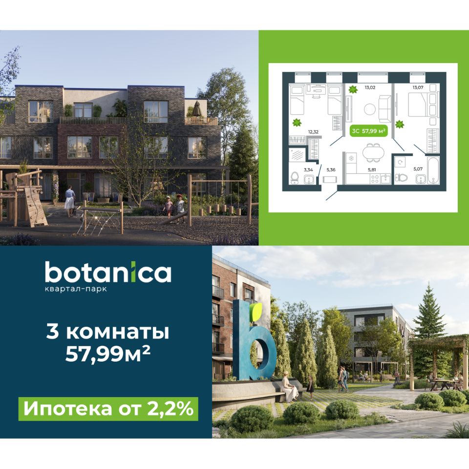Квартира в квартале-парке комфорт-класса ''Ботаника'' (Кольцово, Новосибирск). Продуманная планировка, большие окна и зелёное окружение создают комфортную атмосферу для жизни. Территория закрыта от машин, есть детские и спортивные площадки, скейт-парк и теннисный корт. Подходит для семей, молодых специалистов и тех, кто ценит тишину, свежий воздух и современный формат загородного комфорта рядом с городом.
