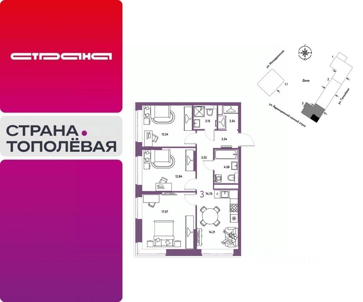Новая квартира в ЖК ''Страна.Тополёвая'' напрямую от федерального застройщика ''Страна Девелопмент''. Продается 3комнатная квартира на 3 этаже от застройщика Страна Девелопмент. Площадь квартиры 74,7 кв. м. Жилой комплекс ''Страна.Тополёвая'' — новый проект федерального застройщика ''Страна Девелопмент'' в Новосибирске. Он раскинется в 20 минутах ходьбы от центра. ПРЕИМУЩЕСТВА •Удачная локация. Оцените все преимущества жизни на Ипподромской улице, которая считается главной городской артерией, связывающей между собой Октябрьский, Центральный и Калининский районы. •Приватный двор. Для юных жителей предусмотрены игровые площадки с разделением по возрасту. Особого внимания заслуживает озеленение дворовой территории. Различные виды деревьев, кустарники и цветущие многолетники создают у дома атмосферу вечнозелёного парка. •Подземный паркинг. Территория жилого квартала будет свободна от автомобилей. Предусмотрен охраняемый подземный паркинг на 178 машино-мест. О сохранности транспорта можно не беспокоиться — здесь предусмотрено видеонаблюдение и доступ по считыванию номеров или BLE-метке. ОТДЕЛКА Квартиры сдаются с предчистовой отделкой: произведена разводка электричества и отопления, выполнена стяжка пола, стены выровнены ''под маяк'', установлены розетки, выключатели и радиаторы. ДИЗАЙНЕРСКАЯ ОТДЕЛКА При покупке квартиры в ЖК ''Страна.Тополёвая'' можно включить стоимость ремонта в ипотеку. Пять вариантов на выбор: хлопковая нить, серый шторм, белый камень, шалфей, голубой вереск. Включено всё — обои, ламинат, натяжной потолок и даже кондиционер. Также для вас есть четыре варианта ремонта в ванной — акриловая ванна с экраном, смеситель с лейкой, подвесной унитаз, зеркало с подсветкой. Останется только разместить мебель! СПОСОБЫ ПОКУПКИ - ипотека - рассрочка - с использованием материнского капитала - 100% оплата наличными Сотрудники ''Страна Девелопмент'' будут сопровождать вас на каждом этапе сделки, помогут получить одобрение по ипотеке или снизить ежемесячный платеж.