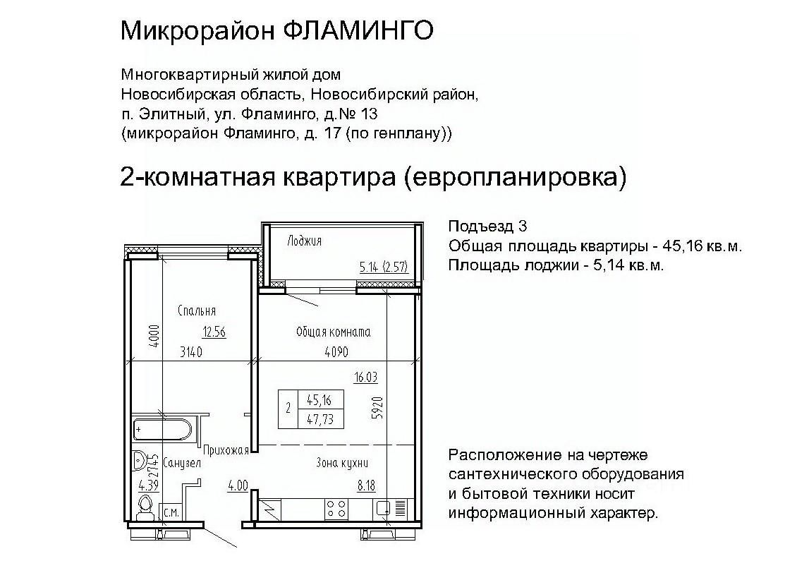 Продаётся 2-комнатная квартира в сданном доме (Фламинго, 17 (поз. 12)), срок сдачи: III-кв. 2018, общей площадью 42.9 кв.м., на 3 этаже. Расположение, транспортная доступность Жилой комплекс ''Фламинго'' расположен в поселкеЭлитный Новосибирского района, на бывших сельскохозяйственных угодьях площадью 45 га, примыкающих к Кировскому району Новосибирска. Микрорайон считается экологически благоприятным пригородом, окруженным кварталами частных домов: по соседству находятся дачныекомплексы и коттеджные поселки ''Березки'' и ''Элитный''. С северной и южной стороны участок застройки граничит с лесополосами. шаговой доступности находится несколько остановок общественного транспорта: около двадцати линий автобусов, маршрутных такси и троллейбусов. Транспортные преимущества для владельцев автомобилей обеспечивает быстрый выезд на Ордынское и Советское шоссе (с новыми развязками), Бугринский мост и Чуйский тракт. Путь на машине до международного аэропорта Толмачево, главного железнодорожного вокзала или центра Новосибирска займет около сорока минут, до автовокзала - полчаса, до площади Карла Маркса (центр левобережья) - двадцать минут. Инфраструктура В микрорайоне Фламинго запланировано строительство спортивного комплекса ''Магис-Фламинго'' с бассейном и лыжно-тренировочной базой. В детском саду предусмотрено 330 мест, в общеобразовательной школе - 1100 мест. В поселке есть поликлиника на 300 посещений в смену, Дом культуры (более 40 кружков и секций), две общеобразовательные школы, колледж, несколько детских садов, библиотека. В шаговой доступности расположена ледовая арена, стадион, городок аттракционов, кинотеатр, сквер, несколько продуктовых магазинов, кафе, аптек, торговый комплекс и рынок. На общественном транспорте можно доехать до гипермаркета ''Метро'', площади Маркса с крупными торговыми комплексами и многочисленными объектами инфраструктуры, а также до центральных районов Новосибирска. Надежность застройщика Масштабный проект реализует алтайская компания ''Жилищная инициатива'', основанная в 1998 году в Барнауле. Комплексное освоение земель - приоритетное направление в девелоперских проектах компании. В активе застройщика жилые комплексы в Барнауле: ''Рубин'', ''Дружный'', ''Дмитровские горки'', ''Лазурный''. В 2008 году ''Жилищная инициатива'' вышла на рынок Новосибирска, открыв дочернее подразделение - ООО ''Новосибирский квартал''. Глава обоих предприятий - Ю.А. Гатилов, почетный строитель России. За 20 лет было введено в эксплуатацию более 100 домов, штат компании составляет около 700 человек. Архитектура Жилой комплекс ''Фламинго'' - это 40 пятиэтажных кирпичных и панельных домов и два гаражных комплекса на территории 44,8 га. Всего в комплексе будет представлено 3995 однокомнатных, двухкомнатных и трехкомнатных квартир площадью от 33 до 110 кв. м, расположенных на всех пяти этажах здания. Все квартиры в ЖК ''Фламинго'' передаются покупателям с готовым ремонтом под ключ. Фасады выполнены в светло-серых, бежевых и коричневых оттенках. Наружные стены панельн