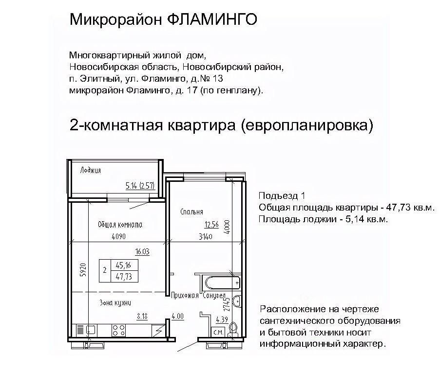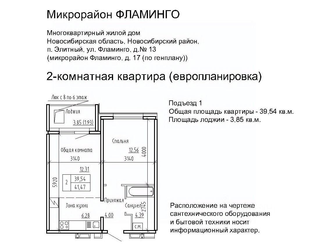 Продаётся 2-комнатная квартира в сданном доме (Фламинго, 17 (поз. 12)), срок сдачи: III-кв. 2018, общей площадью 42.9 кв.м., на 4 этаже. Расположение, транспортная доступность Жилой комплекс ''Фламинго'' расположен в поселкеЭлитный Новосибирского района, на бывших сельскохозяйственных угодьях площадью 45 га, примыкающих к Кировскому району Новосибирска. Микрорайон считается экологически благоприятным пригородом, окруженным кварталами частных домов: по соседству находятся дачныекомплексы и коттеджные поселки ''Березки'' и ''Элитный''. С северной и южной стороны участок застройки граничит с лесополосами. шаговой доступности находится несколько остановок общественного транспорта: около двадцати линий автобусов, маршрутных такси и троллейбусов. Транспортные преимущества для владельцев автомобилей обеспечивает быстрый выезд на Ордынское и Советское шоссе (с новыми развязками), Бугринский мост и Чуйский тракт. Путь на машине до международного аэропорта Толмачево, главного железнодорожного вокзала или центра Новосибирска займет около сорока минут, до автовокзала - полчаса, до площади Карла Маркса (центр левобережья) - двадцать минут. Инфраструктура В микрорайоне Фламинго запланировано строительство спортивного комплекса ''Магис-Фламинго'' с бассейном и лыжно-тренировочной базой. В детском саду предусмотрено 330 мест, в общеобразовательной школе - 1100 мест. В поселке есть поликлиника на 300 посещений в смену, Дом культуры (более 40 кружков и секций), две общеобразовательные школы, колледж, несколько детских садов, библиотека. В шаговой доступности расположена ледовая арена, стадион, городок аттракционов, кинотеатр, сквер, несколько продуктовых магазинов, кафе, аптек, торговый комплекс и рынок. На общественном транспорте можно доехать до гипермаркета ''Метро'', площади Маркса с крупными торговыми комплексами и многочисленными объектами инфраструктуры, а также до центральных районов Новосибирска. Надежность застройщика Масштабный проект реализует алтайская компания ''Жилищная инициатива'', основанная в 1998 году в Барнауле. Комплексное освоение земель - приоритетное направление в девелоперских проектах компании. В активе застройщика жилые комплексы в Барнауле: ''Рубин'', ''Дружный'', ''Дмитровские горки'', ''Лазурный''. В 2008 году ''Жилищная инициатива'' вышла на рынок Новосибирска, открыв дочернее подразделение - ООО ''Новосибирский квартал''. Глава обоих предприятий - Ю.А. Гатилов, почетный строитель России. За 20 лет было введено в эксплуатацию более 100 домов, штат компании составляет около 700 человек. Архитектура Жилой комплекс ''Фламинго'' - это 40 пятиэтажных кирпичных и панельных домов и два гаражных комплекса на территории 44,8 га. Всего в комплексе будет представлено 3995 однокомнатных, двухкомнатных и трехкомнатных квартир площадью от 33 до 110 кв. м, расположенных на всех пяти этажах здания. Все квартиры в ЖК ''Фламинго'' передаются покупателям с готовым ремонтом под ключ. Фасады выполнены в светло-серых, бежевых и коричневых оттенках. Наружные стены панельн
