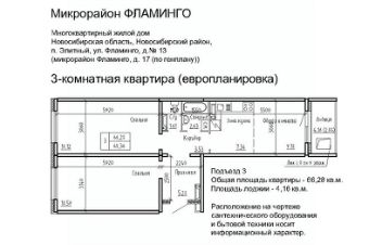 Продаётся 3-комнатная квартира в сданном доме (Фламинго, 17 (поз. 12)), срок сдачи: III-кв. 2018, общей площадью 70 кв.м., на 5 этаже. Расположение, транспортная доступность Жилой комплекс ''Фламинго'' расположен в поселкеЭлитный Новосибирского района, на бывших сельскохозяйственных угодьях площадью 45 га, примыкающих к Кировскому району Новосибирска. Микрорайон считается экологически благоприятным пригородом, окруженным кварталами частных домов: по соседству находятся дачныекомплексы и коттеджные поселки ''Березки'' и ''Элитный''. С северной и южной стороны участок застройки граничит с лесополосами. шаговой доступности находится несколько остановок общественного транспорта: около двадцати линий автобусов, маршрутных такси и троллейбусов. Транспортные преимущества для владельцев автомобилей обеспечивает быстрый выезд на Ордынское и Советское шоссе (с новыми развязками), Бугринский мост и Чуйский тракт. Путь на машине до международного аэропорта Толмачево, главного железнодорожного вокзала или центра Новосибирска займет около сорока минут, до автовокзала - полчаса, до площади Карла Маркса (центр левобережья) - двадцать минут. Инфраструктура В микрорайоне Фламинго запланировано строительство спортивного комплекса ''Магис-Фламинго'' с бассейном и лыжно-тренировочной базой. В детском саду предусмотрено 330 мест, в общеобразовательной школе - 1100 мест. В поселке есть поликлиника на 300 посещений в смену, Дом культуры (более 40 кружков и секций), две общеобразовательные школы, колледж, несколько детских садов, библиотека. В шаговой доступности расположена ледовая арена, стадион, городок аттракционов, кинотеатр, сквер, несколько продуктовых магазинов, кафе, аптек, торговый комплекс и рынок. На общественном транспорте можно доехать до гипермаркета ''Метро'', площади Маркса с крупными торговыми комплексами и многочисленными объектами инфраструктуры, а также до центральных районов Новосибирска. Надежность застройщика Масштабный проект реализует алтайская компания ''Жилищная инициатива'', основанная в 1998 году в Барнауле. Комплексное освоение земель - приоритетное направление в девелоперских проектах компании. В активе застройщика жилые комплексы в Барнауле: ''Рубин'', ''Дружный'', ''Дмитровские горки'', ''Лазурный''. В 2008 году ''Жилищная инициатива'' вышла на рынок Новосибирска, открыв дочернее подразделение - ООО ''Новосибирский квартал''. Глава обоих предприятий - Ю.А. Гатилов, почетный строитель России. За 20 лет было введено в эксплуатацию более 100 домов, штат компании составляет около 700 человек. Архитектура Жилой комплекс ''Фламинго'' - это 40 пятиэтажных кирпичных и панельных домов и два гаражных комплекса на территории 44,8 га. Всего в комплексе будет представлено 3995 однокомнатных, двухкомнатных и трехкомнатных квартир площадью от 33 до 110 кв. м, расположенных на всех пяти этажах здания. Все квартиры в ЖК ''Фламинго'' передаются покупателям с готовым ремонтом под ключ. Фасады выполнены в светло-серых, бежевых и коричневых оттенках. Наружные стены панельных