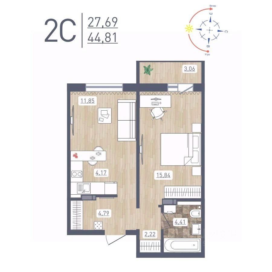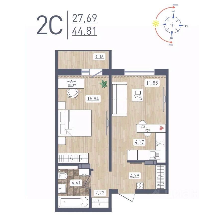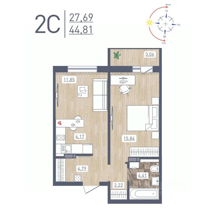 Продаётся 2-комнатная квартира в сданном доме (Забалуева, 69 (Дом 9)), срок сдачи: IV-кв. 2024, общей площадью 44.81 кв.м., на 11 этаже. Расположение, транспортная доступность Жилой комплекс ''Радуга Сибири'', занимающий территорию 10,4 га, расположен на берегу озера, в Ленинском районе Новосибирска. Это экологически благоприятный регион на левом берегу Оби. В двадцати минутах пешком находится железнодорожная платформа пригородного направления ''Ипподром''. Электричка доезжает до центра Новосибирска за 25 минут. От комплекса организовано движение маршрутного такси 12, на котором можно доехать до центра Левобережья (метро ''Площадь Маркса'') и главного железнодорожного вокзала Новосибирска. Путь на автомобиле до площади Маркса или международного аэропорта займет пятнадцать минут, до центра Новосибирска - двадцать минут. Район развивается: по соседству с ''Радугой Сибири'' построен жилой микрорайон ''Чистая Слобода'', планируется расширение Порт-Артурской улицы, продление улицы Титова. В 2016 году было запущено движение скоростного трамвая. Инфраструктура В цокольных этажах домов находятся коммерческие помещения. Вблизи комплекса ''Радуга Сибири'' расположены два детских сада, строится школа, планируется открытие поликлиники. За двадцать минут можно дойти до общеобразовательной школы 86 - в ней был построен спортивный зал и сделан ремонт в 2015 году. В пешей доступности находятся: Дворец культуры ''Сибтекстильмаш'' с кружками и секциями, Троице-Владимирский собор и Новосибирский ипподром. Вблизи ЖК много зеленых насаждений, пешком можно дойти до парка и сквера. На расстоянии 3 км от комплекса расположены МНТК ''Хирургия глаза'' им. С.Н Федорова, плавательный бассейн и спорткомплекс ''Заря'' со стадионом, зимним катком, футбольными и хоккейными площадками. Надежность застройщика Проект комплексной застройки ''Радуга Сибири'' реализует ООО ''Развитие'', которое создано в 2012 году и входит в состав промышленно-строительного концерна ''Сибирь''. Концерн работает с 1990 года, среди завершенных объектов - жилые комплексы ''На Рябиновой'', ''Нарымская Жемчужина'', ''Тулинское'', ''Березовое''. В 2012 году компания заняла первое место среди застройщиков Новосибирска по объемам ввода жилья. Градостроительный план ЖК ''Радуга Сибири'' был разработан в 2015 году, в июле этого же года выдано разрешение на строительство. Архитектура Жилой комплекс ''Радуга Сибири'' - это восемь монолитных 17-этажных домов. Здания возводятся по традиционной монолитной технологии: перекрестно-стеновая система с несущими монолитными продольными и поперечными внутренними стенами, объединенными железобетонными перекрытиями. При строительстве применяется тоннельная опалубка Teknik-L. Квартиры сдаются с предчистовой отделкой, качественными деревянными стеклопакетами, улучшенной шумоизоляцией. Стены выровнены и оштукатурены, полы выровнены. В квартирах выполняется разводка электричества и вертикальная разводка системы отопления, подводятся трубы холодной и горячей воды, канализации, устанавливаются счетчики на