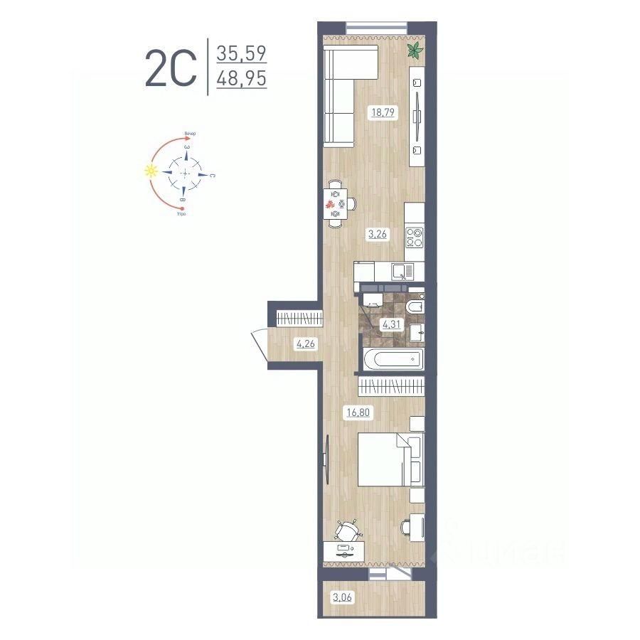 Продаётся 2-комнатная квартира в сданном доме (Забалуева, 69 (Дом 9)), срок сдачи: IV-кв. 2024, общей площадью 48.95 кв.м., на 10 этаже. Расположение, транспортная доступность Жилой комплекс ''Радуга Сибири'', занимающий территорию 10,4 га, расположен на берегу озера, в Ленинском районе Новосибирска. Это экологически благоприятный регион на левом берегу Оби. В двадцати минутах пешком находится железнодорожная платформа пригородного направления ''Ипподром''. Электричка доезжает до центра Новосибирска за 25 минут. От комплекса организовано движение маршрутного такси 12, на котором можно доехать до центра Левобережья (метро ''Площадь Маркса'') и главного железнодорожного вокзала Новосибирска. Путь на автомобиле до площади Маркса или международного аэропорта займет пятнадцать минут, до центра Новосибирска - двадцать минут. Район развивается: по соседству с ''Радугой Сибири'' построен жилой микрорайон ''Чистая Слобода'', планируется расширение Порт-Артурской улицы, продление улицы Титова. В 2016 году было запущено движение скоростного трамвая. Инфраструктура В цокольных этажах домов находятся коммерческие помещения. Вблизи комплекса ''Радуга Сибири'' расположены два детских сада, строится школа, планируется открытие поликлиники. За двадцать минут можно дойти до общеобразовательной школы 86 - в ней был построен спортивный зал и сделан ремонт в 2015 году. В пешей доступности находятся: Дворец культуры ''Сибтекстильмаш'' с кружками и секциями, Троице-Владимирский собор и Новосибирский ипподром. Вблизи ЖК много зеленых насаждений, пешком можно дойти до парка и сквера. На расстоянии 3 км от комплекса расположены МНТК ''Хирургия глаза'' им. С.Н Федорова, плавательный бассейн и спорткомплекс ''Заря'' со стадионом, зимним катком, футбольными и хоккейными площадками. Надежность застройщика Проект комплексной застройки ''Радуга Сибири'' реализует ООО ''Развитие'', которое создано в 2012 году и входит в состав промышленно-строительного концерна ''Сибирь''. Концерн работает с 1990 года, среди завершенных объектов - жилые комплексы ''На Рябиновой'', ''Нарымская Жемчужина'', ''Тулинское'', ''Березовое''. В 2012 году компания заняла первое место среди застройщиков Новосибирска по объемам ввода жилья. Градостроительный план ЖК ''Радуга Сибири'' был разработан в 2015 году, в июле этого же года выдано разрешение на строительство. Архитектура Жилой комплекс ''Радуга Сибири'' - это восемь монолитных 17-этажных домов. Здания возводятся по традиционной монолитной технологии: перекрестно-стеновая система с несущими монолитными продольными и поперечными внутренними стенами, объединенными железобетонными перекрытиями. При строительстве применяется тоннельная опалубка Teknik-L. Квартиры сдаются с предчистовой отделкой, качественными деревянными стеклопакетами, улучшенной шумоизоляцией. Стены выровнены и оштукатурены, полы выровнены. В квартирах выполняется разводка электричества и вертикальная разводка системы отопления, подводятся трубы холодной и горячей воды, канализации, устанавливаются счетчики на