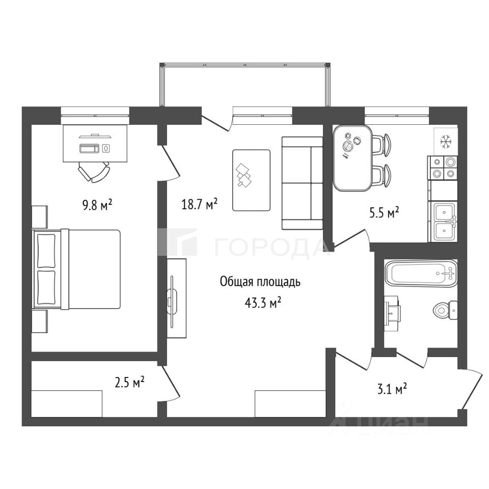 43 м² · Этаж 9 из 9