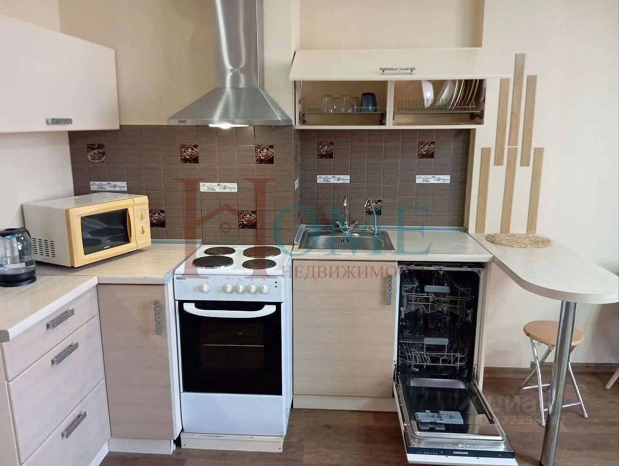 Вся бытовая техника (стиральная машина автомат, СВЧ, ТВ, холодильник, набор посуды). 7 минут от метро. Стенка, диван, кухонный гарнитур, гардеробная. В с/у кафель, ламинат, обои.