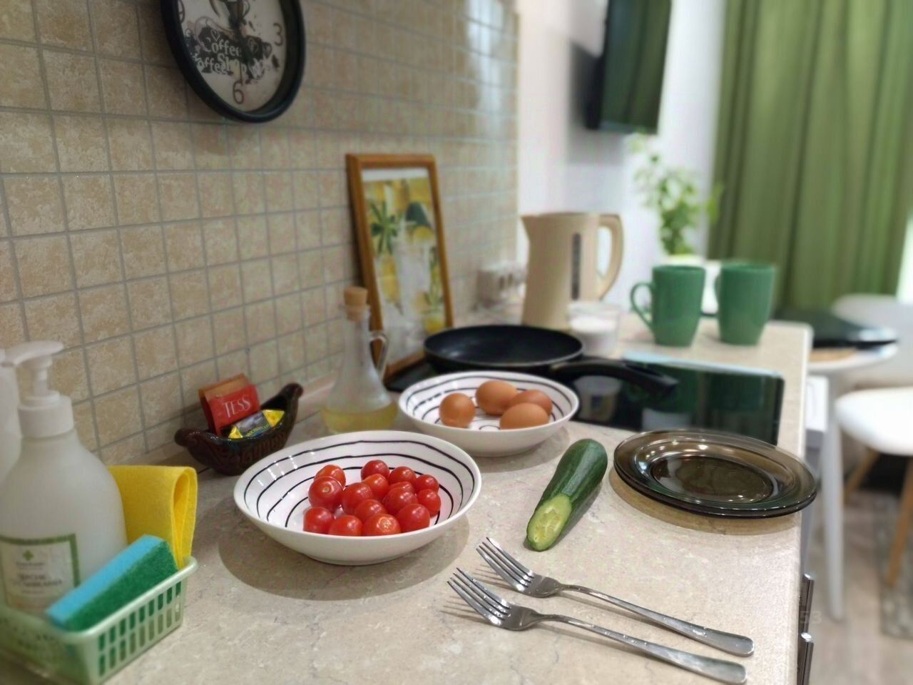 в квартире есть все для проживания. кровать . холодильник. плита. и тд.