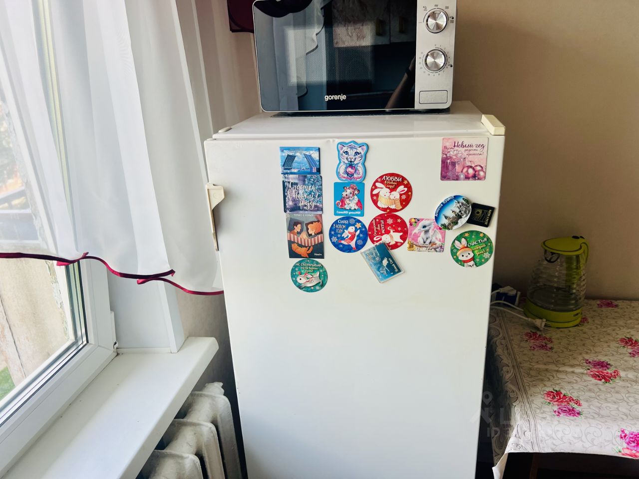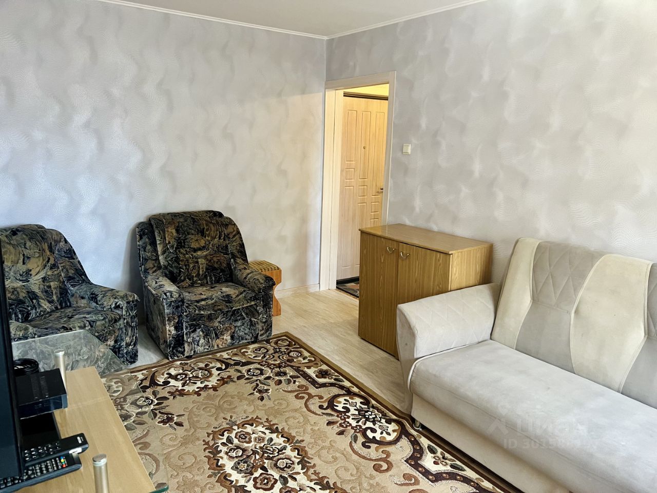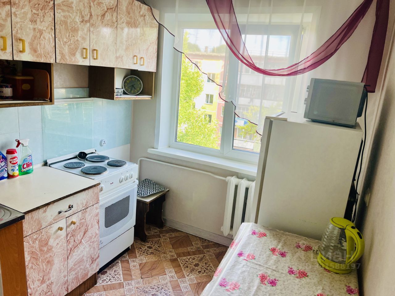 раскладной диван, телевизор, стол, стиральная машина автомат, плита с духовым шкафом, холодильник, микроволновая печь, чайник.
