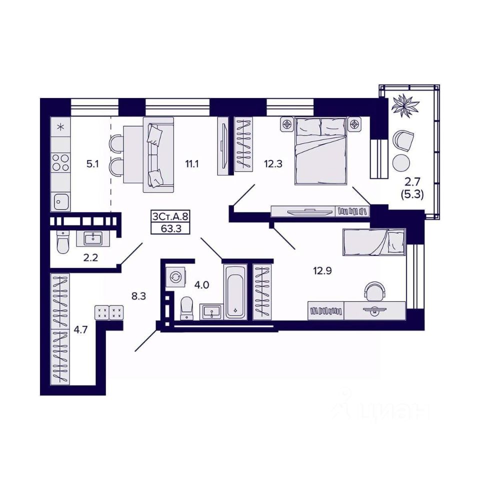 Общая площадь63,3 м2
