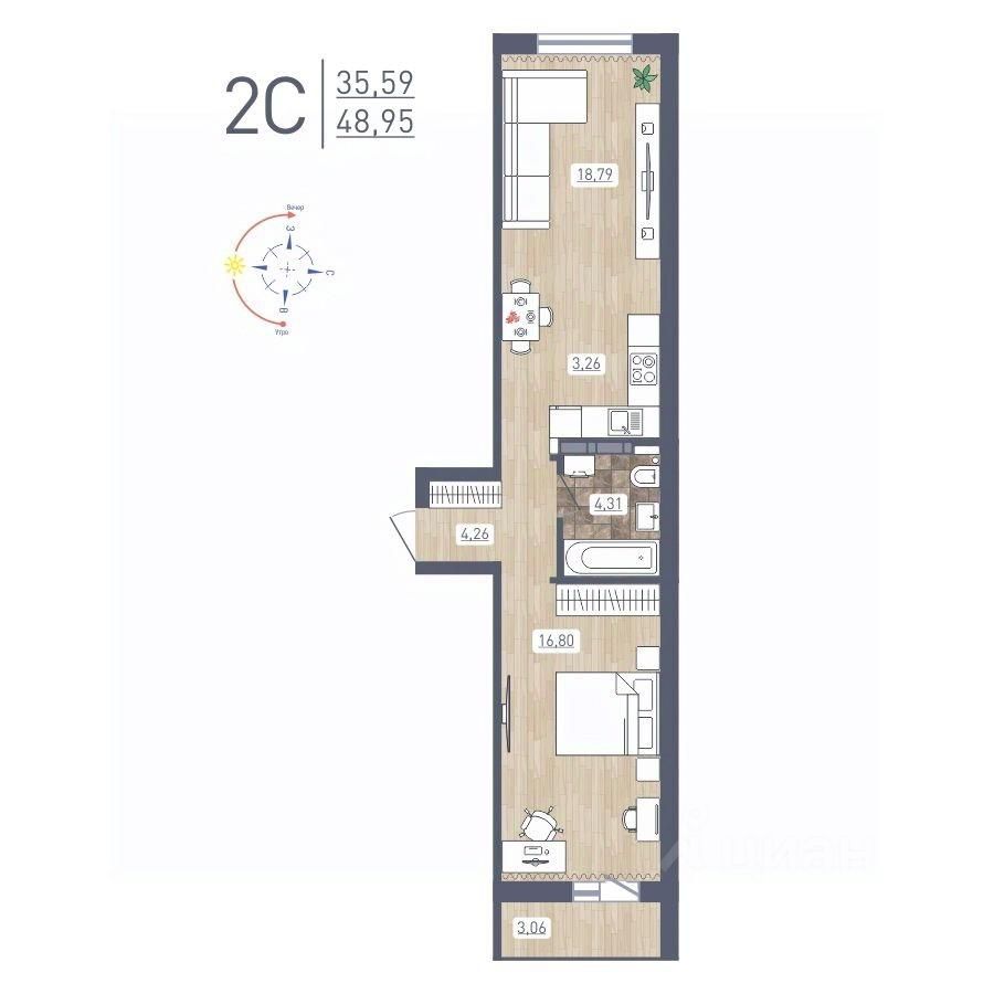 Продаётся 2-комнатная квартира в сданном доме (Забалуева, 69 (Дом 9)), срок сдачи: IV-кв. 2024, общей площадью 48.95 кв.м., на 17 этаже. Расположение, транспортная доступность Жилой комплекс ''Радуга Сибири'', занимающий территорию 10,4 га, расположен на берегу озера, в Ленинском районе Новосибирска. Это экологически благоприятный регион на левом берегу Оби. В двадцати минутах пешком находится железнодорожная платформа пригородного направления ''Ипподром''. Электричка доезжает до центра Новосибирска за 25 минут. От комплекса организовано движение маршрутного такси 12, на котором можно доехать до центра Левобережья (метро ''Площадь Маркса'') и главного железнодорожного вокзала Новосибирска. Путь на автомобиле до площади Маркса или международного аэропорта займет пятнадцать минут, до центра Новосибирска - двадцать минут. Район развивается: по соседству с ''Радугой Сибири'' построен жилой микрорайон ''Чистая Слобода'', планируется расширение Порт-Артурской улицы, продление улицы Титова. В 2016 году было запущено движение скоростного трамвая. Инфраструктура В цокольных этажах домов находятся коммерческие помещения. Вблизи комплекса ''Радуга Сибири'' расположены два детских сада, строится школа, планируется открытие поликлиники. За двадцать минут можно дойти до общеобразовательной школы 86 - в ней был построен спортивный зал и сделан ремонт в 2015 году. В пешей доступности находятся: Дворец культуры ''Сибтекстильмаш'' с кружками и секциями, Троице-Владимирский собор и Новосибирский ипподром. Вблизи ЖК много зеленых насаждений, пешком можно дойти до парка и сквера. На расстоянии 3 км от комплекса расположены МНТК ''Хирургия глаза'' им. С.Н Федорова, плавательный бассейн и спорткомплекс ''Заря'' со стадионом, зимним катком, футбольными и хоккейными площадками. Надежность застройщика Проект комплексной застройки ''Радуга Сибири'' реализует ООО ''Развитие'', которое создано в 2012 году и входит в состав промышленно-строительного концерна ''Сибирь''. Концерн работает с 1990 года, среди завершенных объектов - жилые комплексы ''На Рябиновой'', ''Нарымская Жемчужина'', ''Тулинское'', ''Березовое''. В 2012 году компания заняла первое место среди застройщиков Новосибирска по объемам ввода жилья. Градостроительный план ЖК ''Радуга Сибири'' был разработан в 2015 году, в июле этого же года выдано разрешение на строительство. Архитектура Жилой комплекс ''Радуга Сибири'' - это восемь монолитных 17-этажных домов. Здания возводятся по традиционной монолитной технологии: перекрестно-стеновая система с несущими монолитными продольными и поперечными внутренними стенами, объединенными железобетонными перекрытиями. При строительстве применяется тоннельная опалубка Teknik-L. Квартиры сдаются с предчистовой отделкой, качественными деревянными стеклопакетами, улучшенной шумоизоляцией. Стены выровнены и оштукатурены, полы выровнены. В квартирах выполняется разводка электричества и вертикальная разводка системы отопления, подводятся трубы холодной и горячей воды, канализации, устанавливаются счетчики на