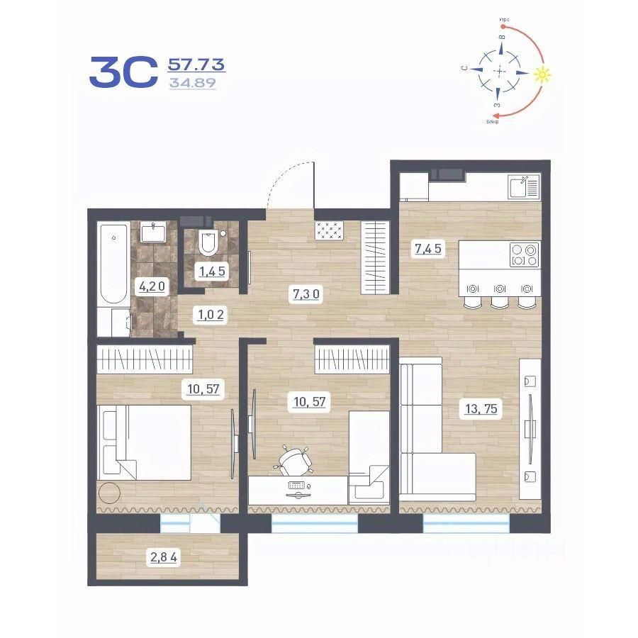 Общая площадь57,73 м2