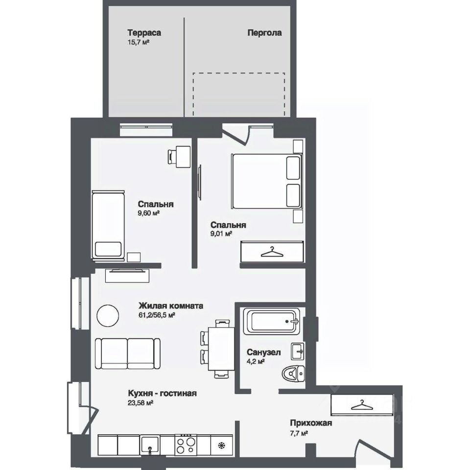 В комплексе представлены студии и 13-комнатные квартиры площадью от 30,2 до 91,9 м². Планировки продуманы для удобной жизни — просторные кухни-гостиные, террасы и панорамные окна наполняют квартиры светом.