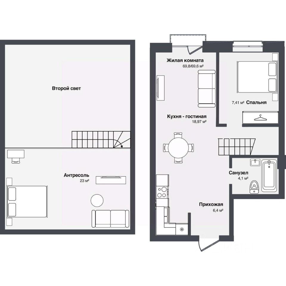 В комплексе представлены студии и 13-комнатные квартиры площадью от 30,2 до 91,9 м². Планировки продуманы для удобной жизни — просторные кухни-гостиные, террасы и панорамные окна наполняют квартиры светом.