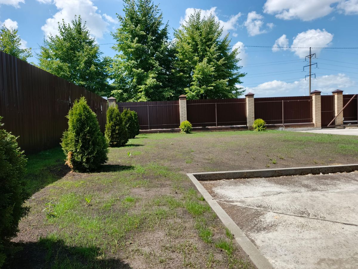 На участке высажен газон и туи.