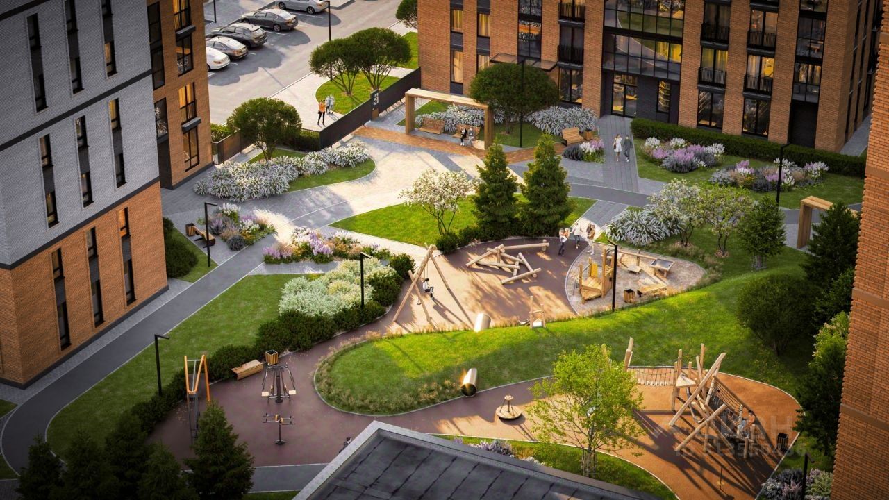 Придомовое пространство комплекса это тихий двор без машин и безопасное проживание. Территория огорожена, оборудована детскими и спортивными площадками для разных возрастов, развивающими игровыми зонами, местами для прогулок и отдыха.