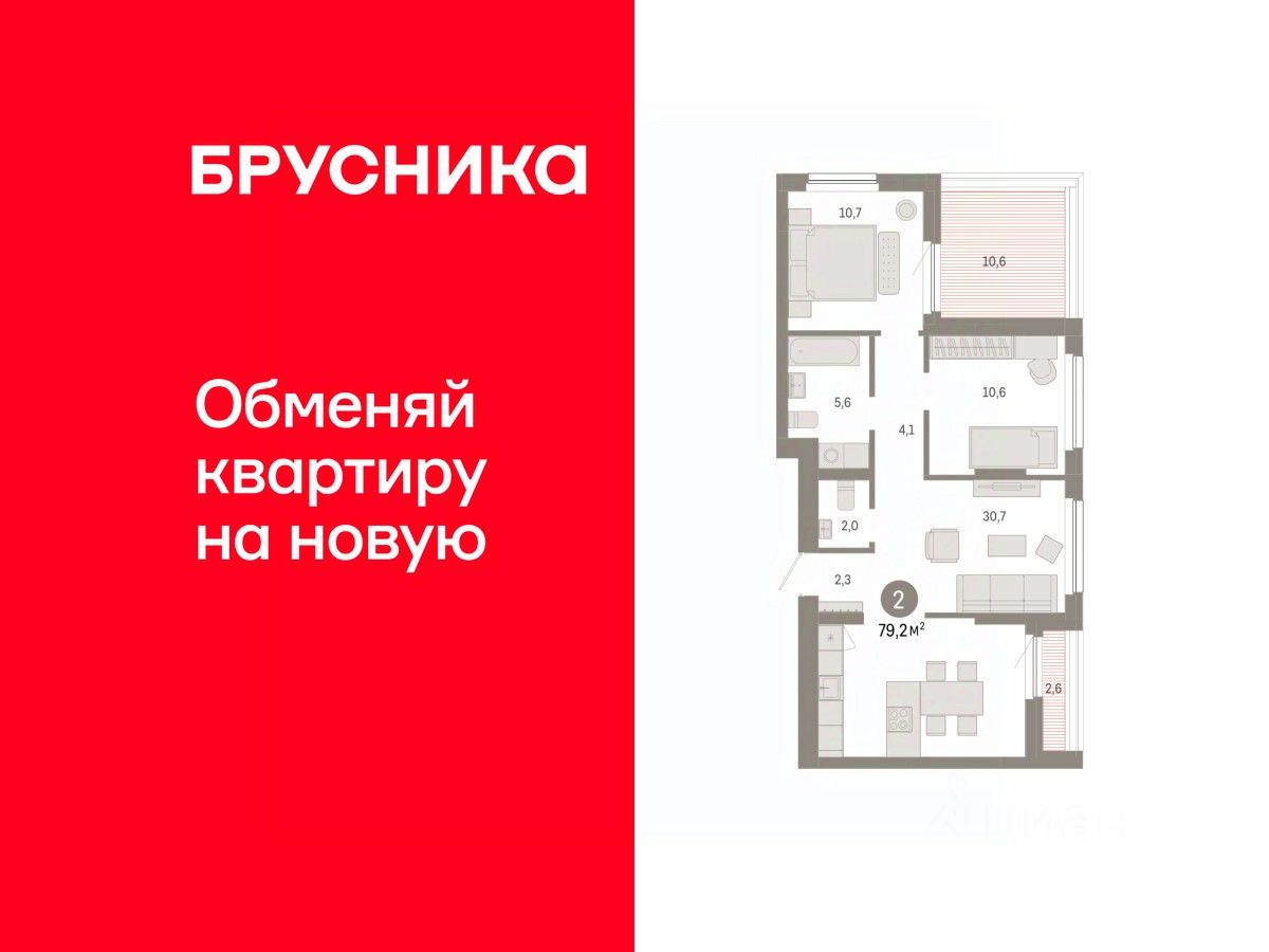 Квартира с кухней-гостиной и двумя спальнями в квартале ''Лебедевский''. Особенности планировки: второй санузел, предчистовая отделка. квартиры в нашей базе: ЛБД01.1-Ж1.12.2.