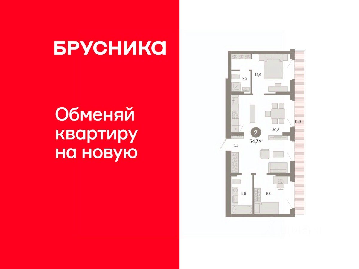 Квартира с кухней-гостиной и двумя спальнями в квартале ''Лебедевский''. Особенности планировки: мастер-спальня, предчистовая отделка. квартиры в нашей базе: ЛБД01.1-Ж2.8.2.