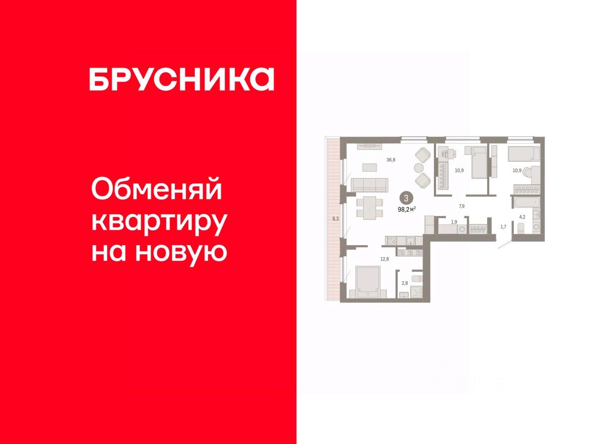 Квартира с кухней-гостиной и тремя спальнями в квартале ''Лебедевский''. Особенности планировки: мастер-спальня, предчистовая отделка.