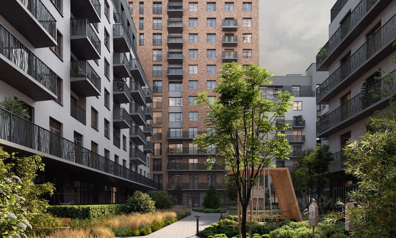 Во дворах микрорайона создано приватное пространство для жителей. Дворы имеют интенсивное озеленение и выполнены в концепции тихого сада с газоном, травами, деревьями и кустарниками. Деревья привезены из европейских питомников и высажены сразу большими. Установлены детские площадки, уличные тренажёры, спортивные корты, предусмотрены места для отдыха взрослых и прогулок.