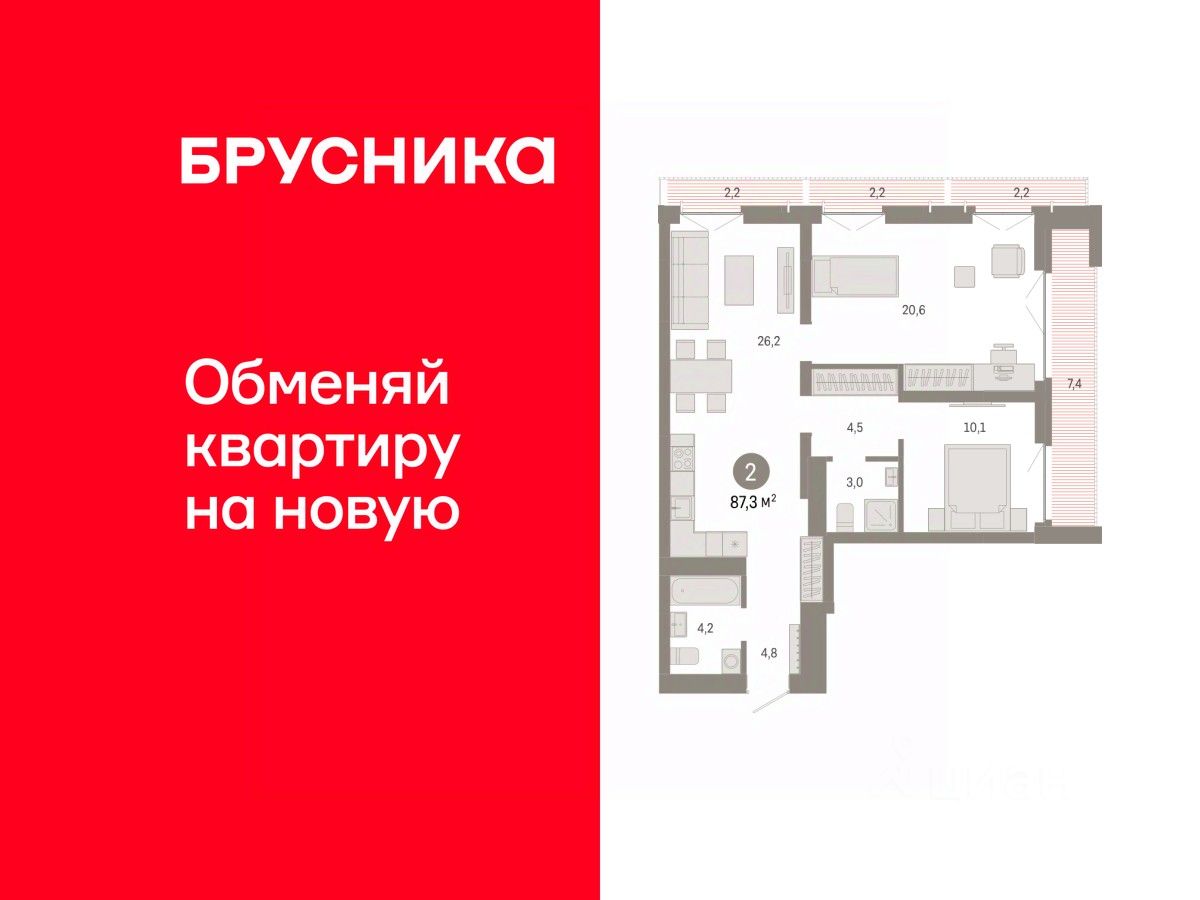 Двухкомнатная квартира от застройщика с предчистовой отделкой в Микрорайон ''Европейский Берег'' на 8 этаже. Общая площадь: 87.29 кв.м., жилая: 30.7 кв.м., площадь просторной кухни-гостиной: 26.2 кв.м. Квартира угловая, очень светлая, естественная вентиляция при открытии окон. В квартире четыре балкона, два совмещенных санузла. Высота потолков 2.7 м.