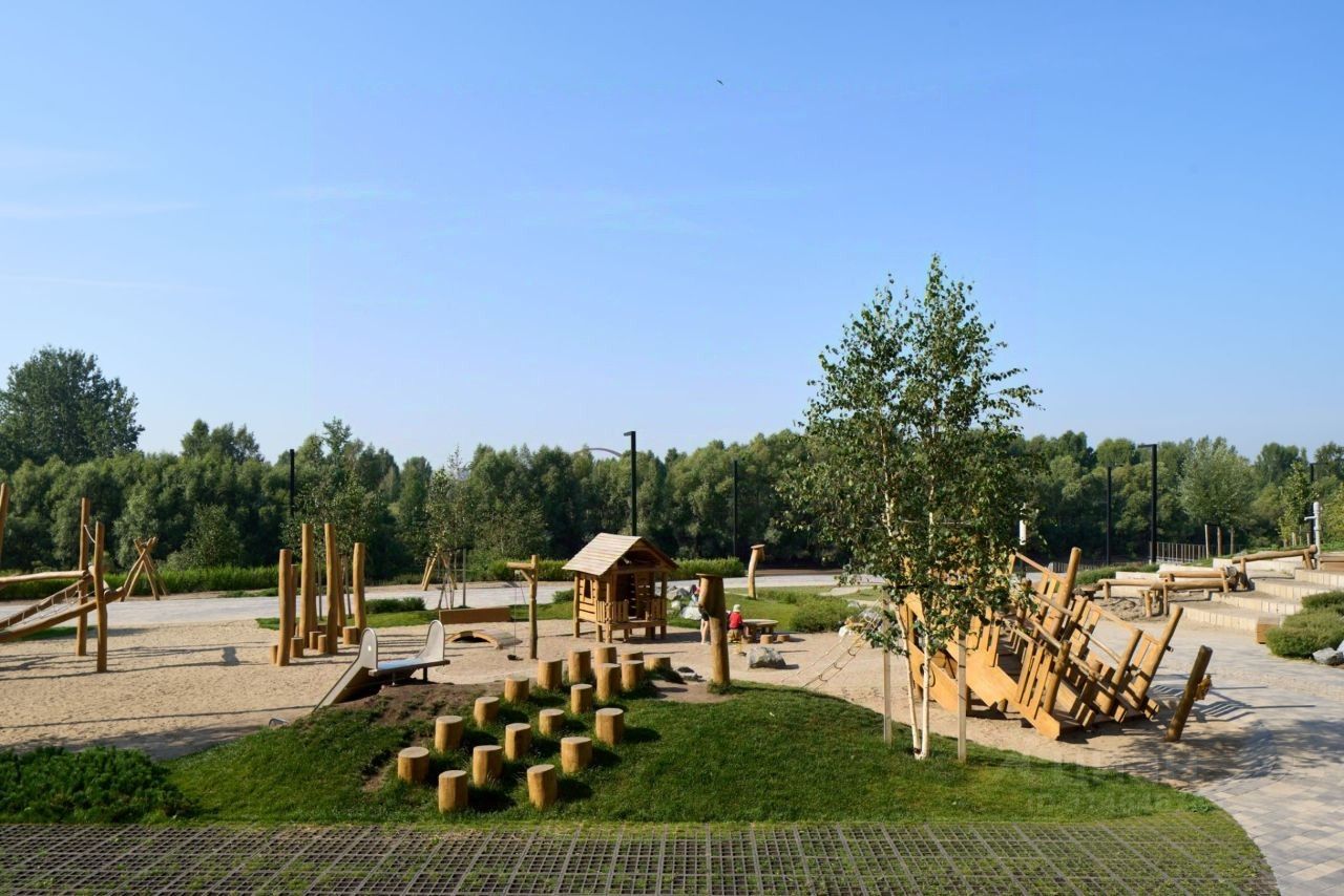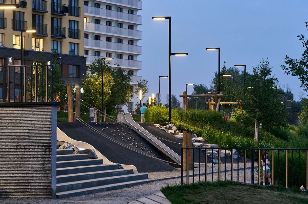 Во дворах микрорайона создано приватное пространство для жителей. Дворы имеют интенсивное озеленение и выполнены в концепции тихого сада с газоном, травами, деревьями и кустарниками. Деревья привезены из европейских питомников и высажены сразу большими. Установлены детские площадки, уличные тренажёры, спортивные корты, предусмотрены места для отдыха взрослых и прогулок.