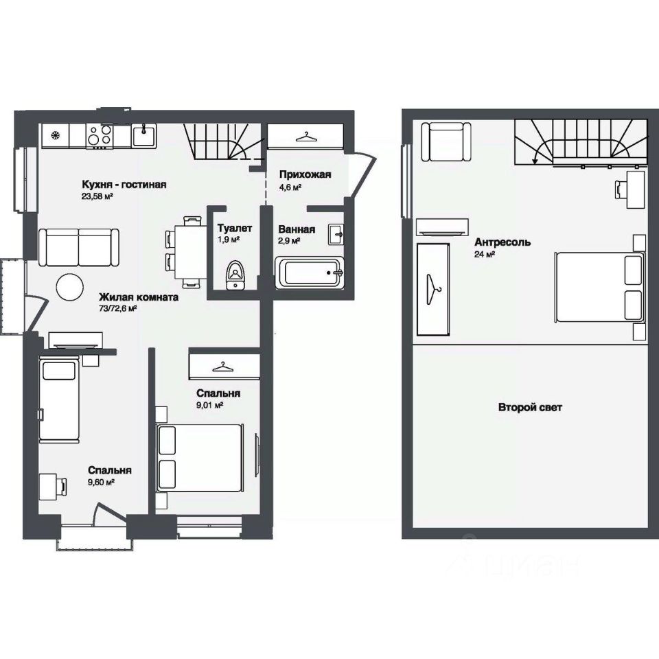 В комплексе представлены студии и 13-комнатные квартиры площадью от 30,2 до 91,9 м². Планировки продуманы для удобной жизни — просторные кухни-гостиные, террасы и панорамные окна наполняют квартиры светом.