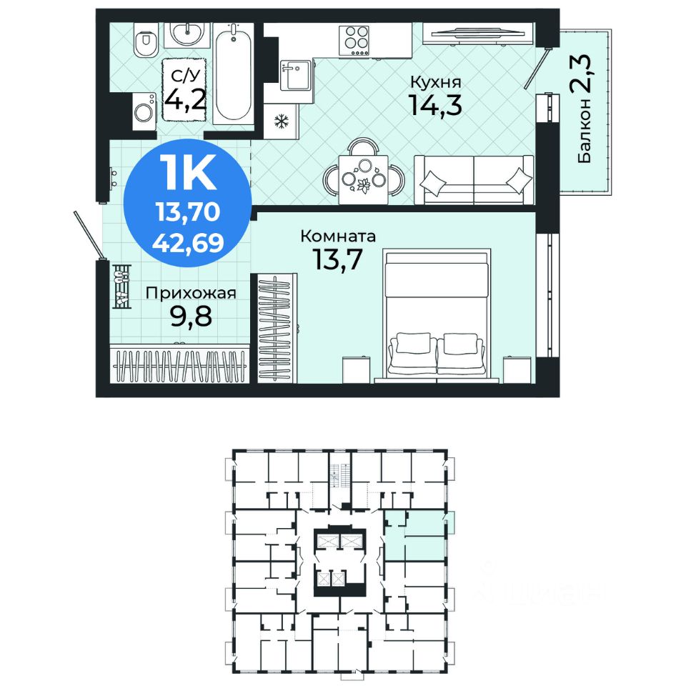 Общая площадь42,69 м2