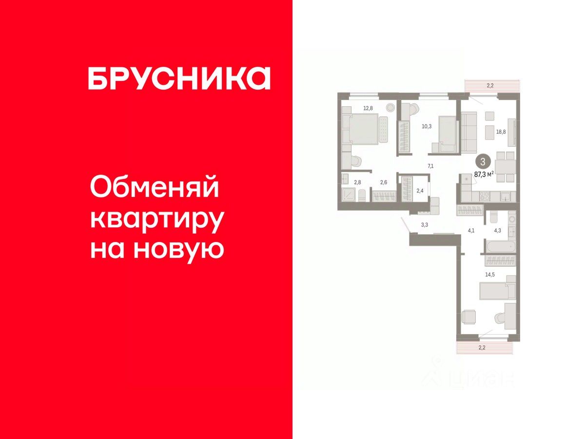 Квартира с кухней-гостиной и тремя спальнями в жилом районе ''Пшеница''. Особенности планировки: балкон, вид во двор, гардеробная, мастер-спальня, окна на две стороны, предчистовая отделка, разнесённые спальни. квартиры в нашей базе: ПШЦ06.1-Ж2.5.9.