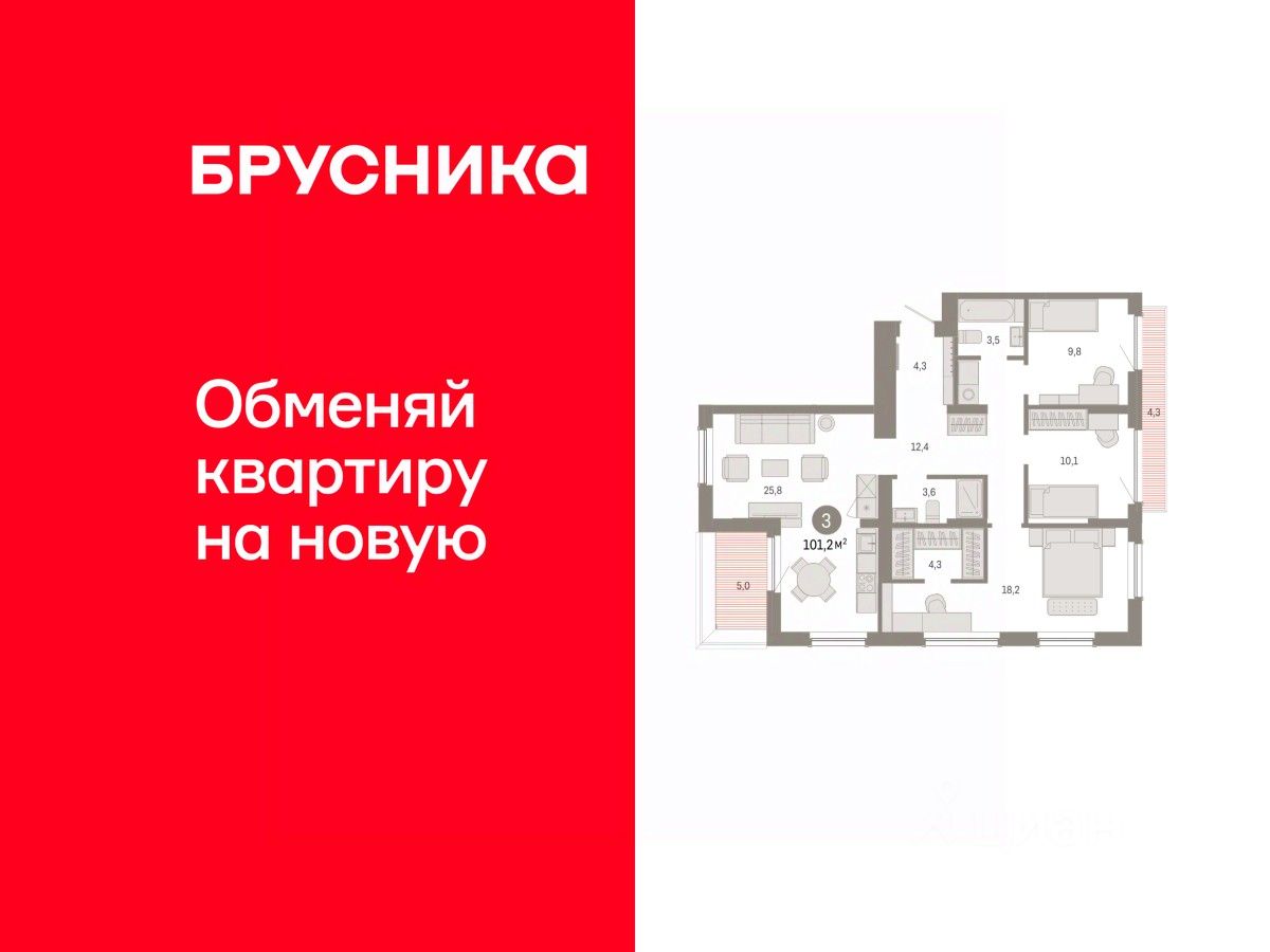 Квартира с кухней-гостиной и тремя спальнями в жилом районе ''Пшеница''. Особенности планировки: балкон, вид во двор, гардеробная, мастер-спальня, предчистовая отделка, разнесённые спальни, терраса на крыше. квартиры в нашей базе: ПШЦ06.1-Ж1.9.1.