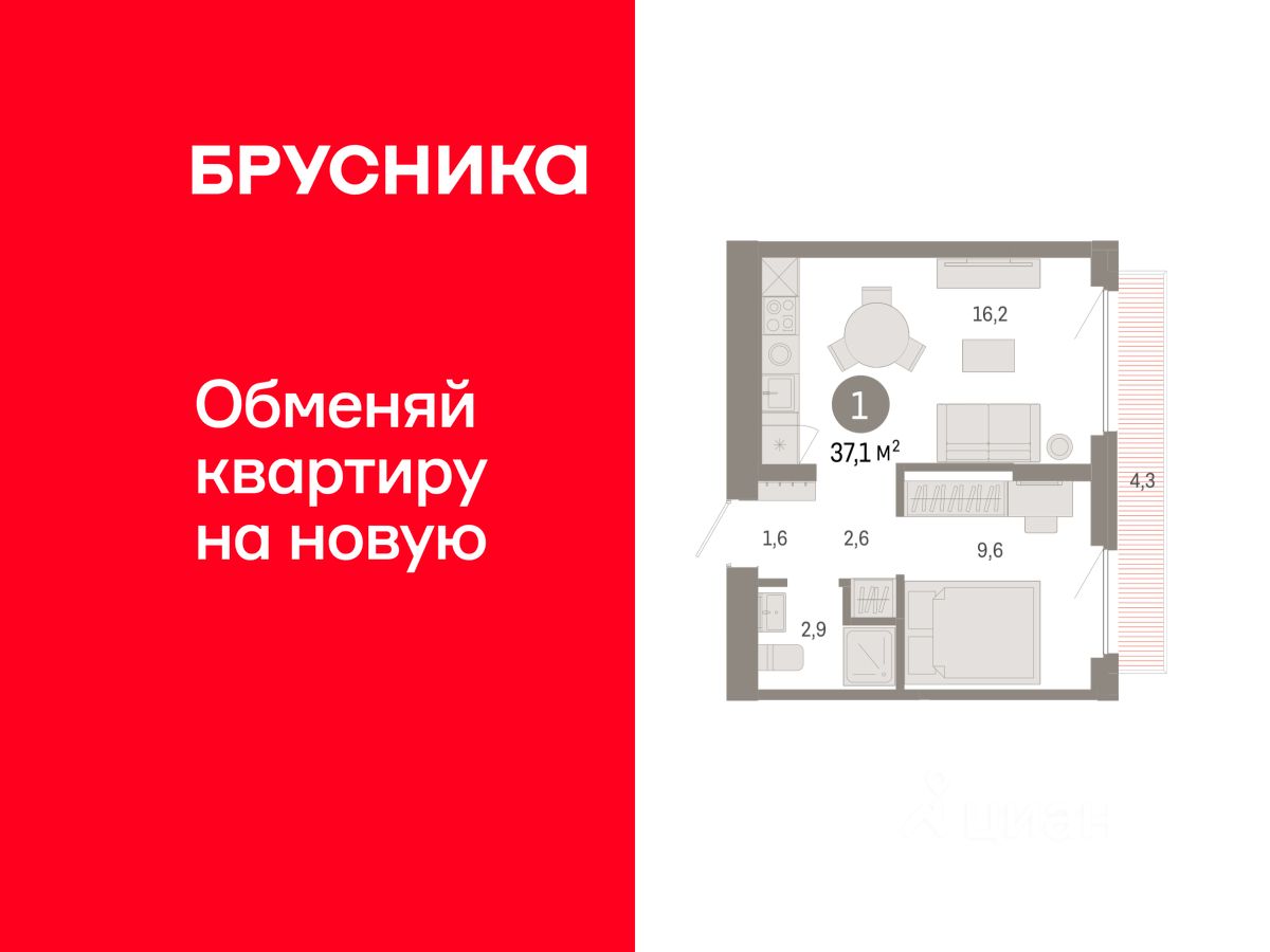 Квартира с кухней-гостиной и одной спальней в жилом районе ''Пшеница''. Особенности планировки: балкон, вид во двор, предчистовая отделка. квартиры в нашей базе: ПШЦ06.1-Ж1.2.6.