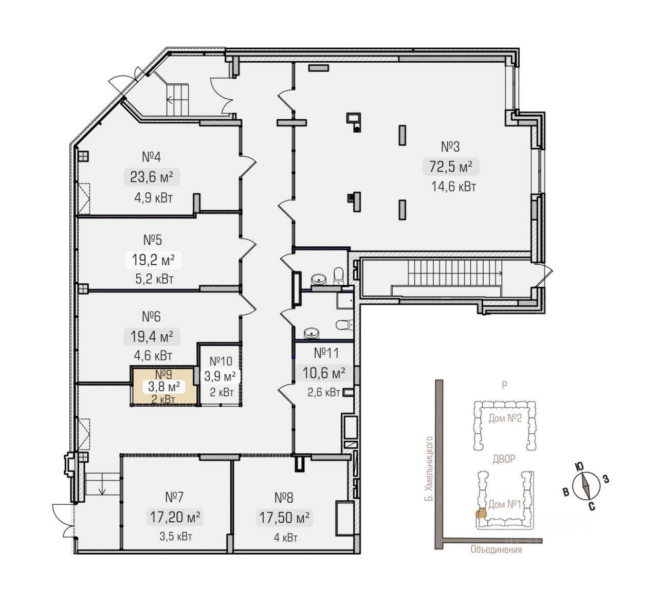 Доступные площади: 3,8 м² (9 на плане) 3,9 м² (10 на плане)