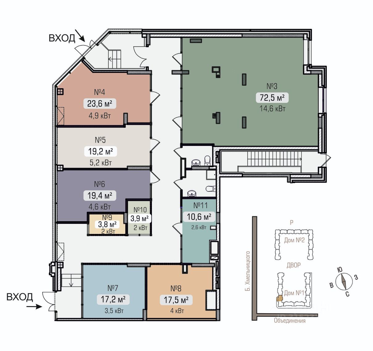 Преимущества: - Разнообразие площадей под офис, магазин, салон, кофейню и другие виды бизнеса - Хорошая проходимость (расположение в жилом комплексе обеспечивает стабильный поток клиентов) - Два входа (удобный доступ для сотрудников и клиентов) - Наличие 2-х санузлов и технических помещений - Помещения оборудованы роллетами на входах