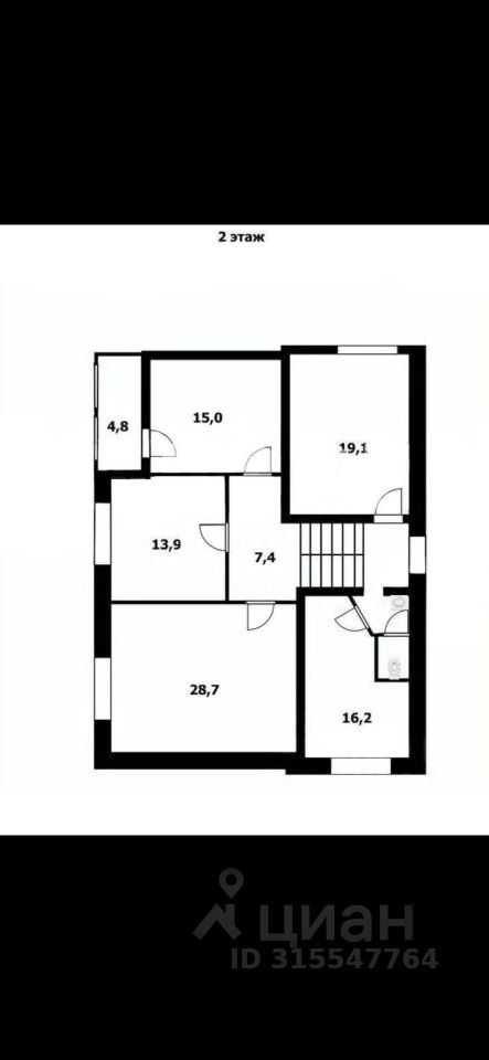 Второй этаж площадью 112 кв.м. Здесь расположены 5 комнат. Одна комната с большой лоджией 5 кв.м. с видом на реку.