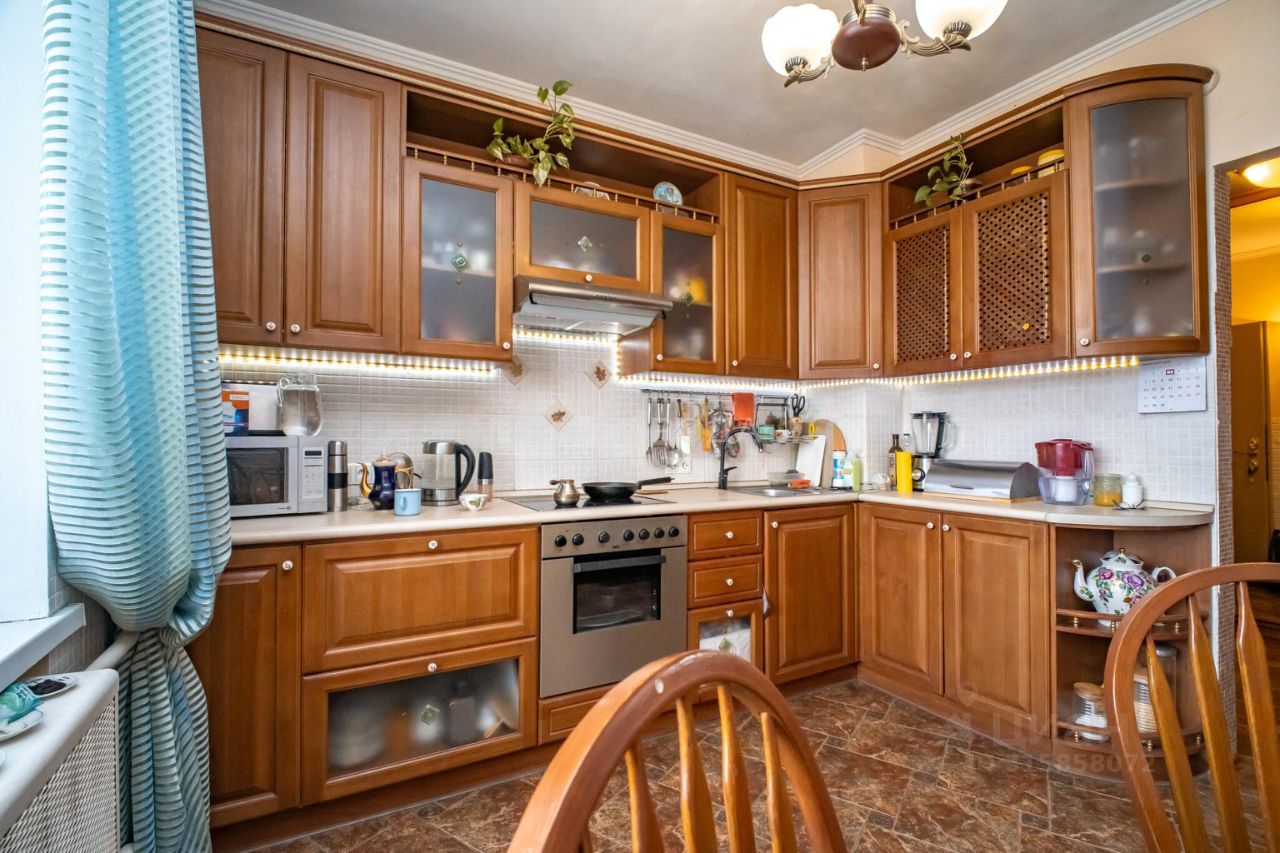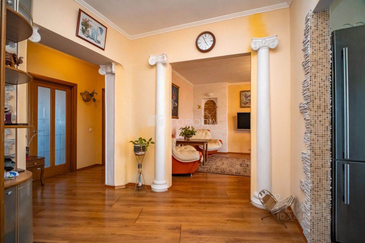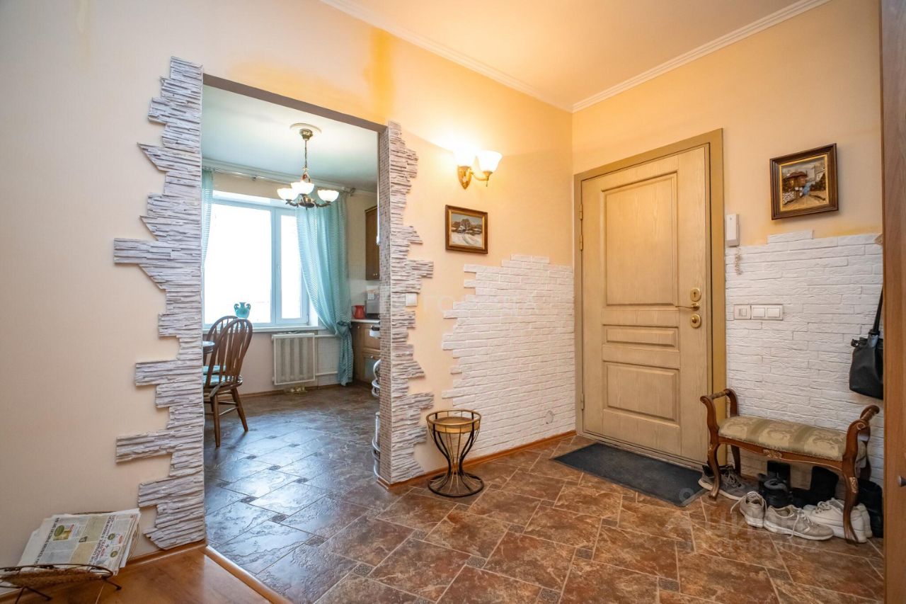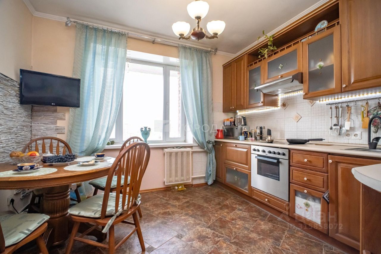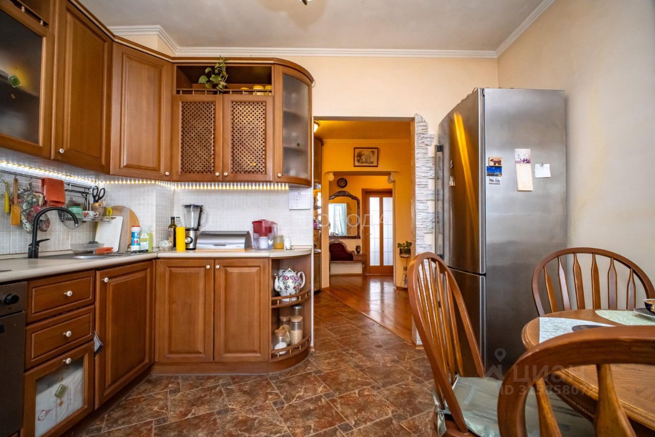 Квартира площадью 91 квадратный метр идеально подойдёт для семьи. Три комнаты изолированы, а кухня занимает 11 квадратных метров. Высота потолков — 2,7 метра, что создаёт ощущение простора и свободы. Дизайнерский ремонт квартиры в средиземноморском стиле добавляет ей уникальности. Новым владельцам остается кухня классического дизайна из натурального дерева.