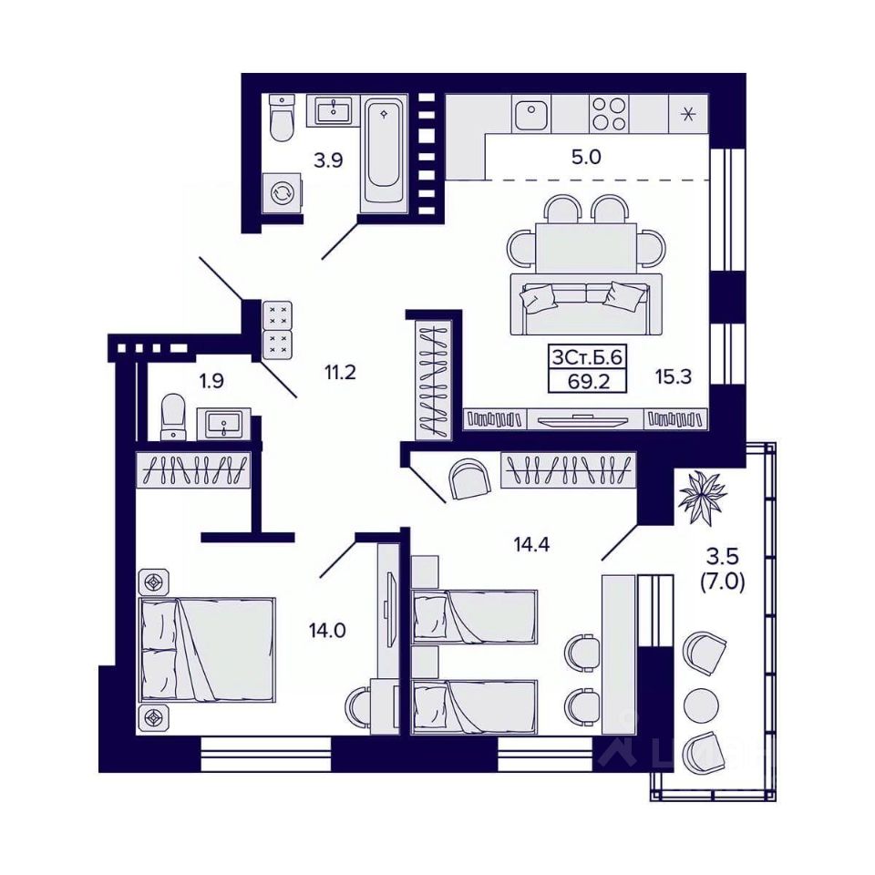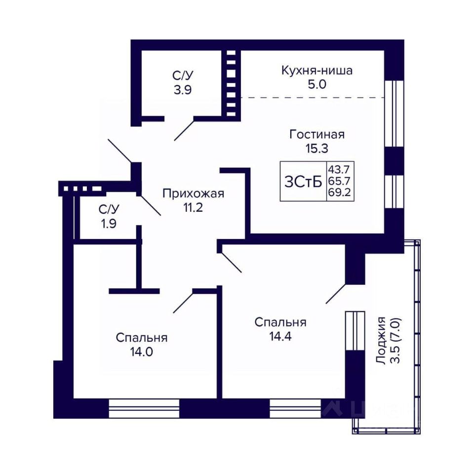 Общая площадь69,2 м2